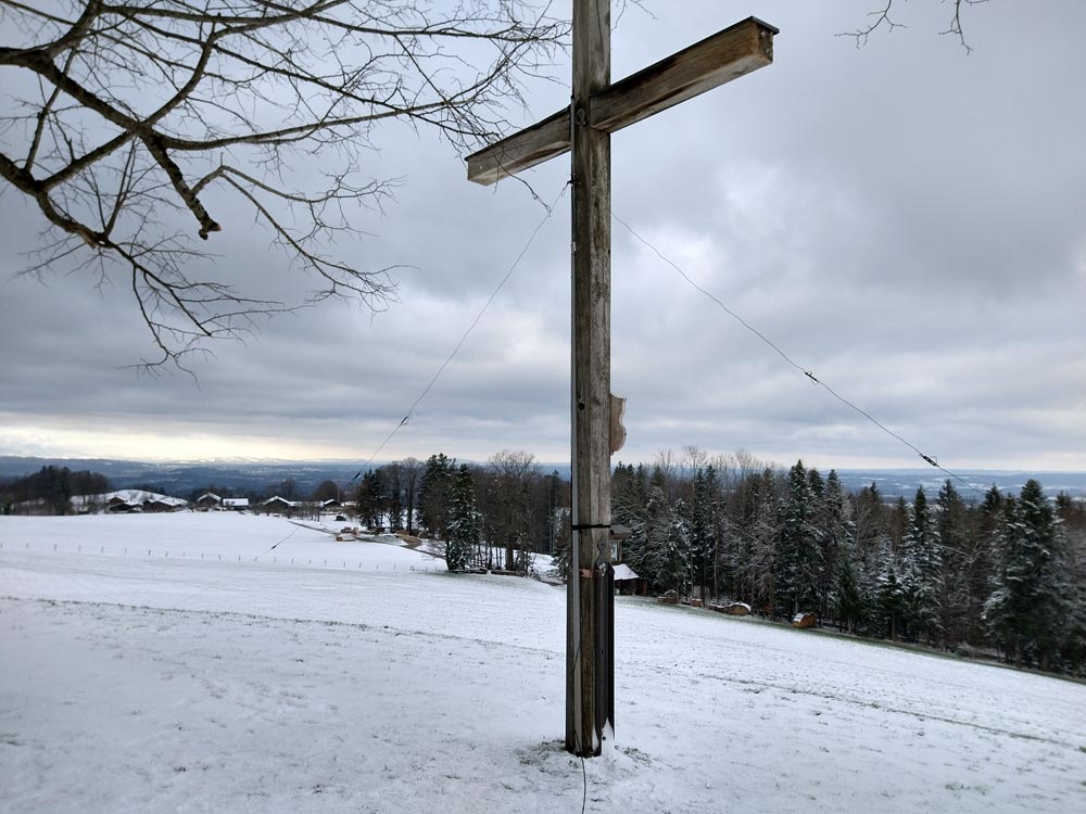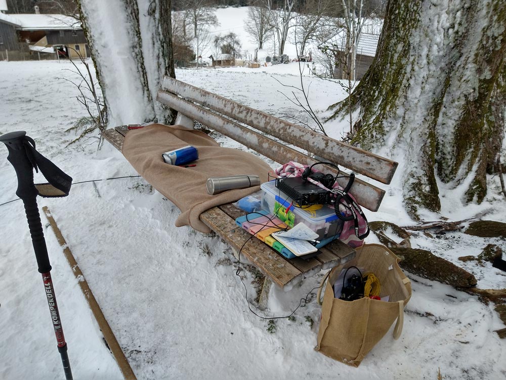 Just got back from a gentle and leisurely activation of my local SOTA summit DL/BE-093, as a rehearsal for Saturday’s party. I can feel my fingers again, but my toes feel like they’re burning with the frost-nip - I’d estimate the wind-chill on the top at -10°C or -15°C. I found it difficult to stand on the summit, with the wind strong enough to blow everything away that wasn’t tied down. Managed to save myself a little effort by strapping the pole to the summit cross, got the antenna strung out, and then realized I’d forgotten to attach the coax cable! Down the pole came, and eventually got everything ship-shape.