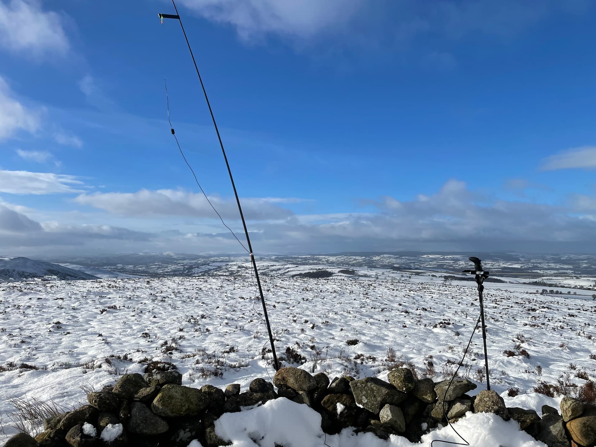 See picture below of both antennas. The horizontal dipole is on the walking pole on the right, it’s hard to see with the snow behind.