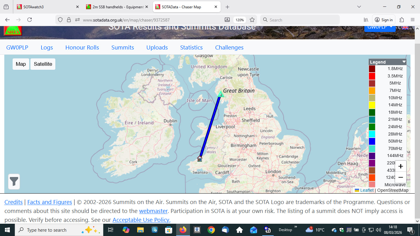 When I first moved to G/LD land about 8 years ago I couldn’t believe the first 2m S2S contact I had with GW/MW. 5/8 reports both ways with both of us using 5W FM and RH770 ½-wave whips. He sounded like he was local. VHF radio was made for mountain to mountain dx contacts especially with some of the RF path over the sea.