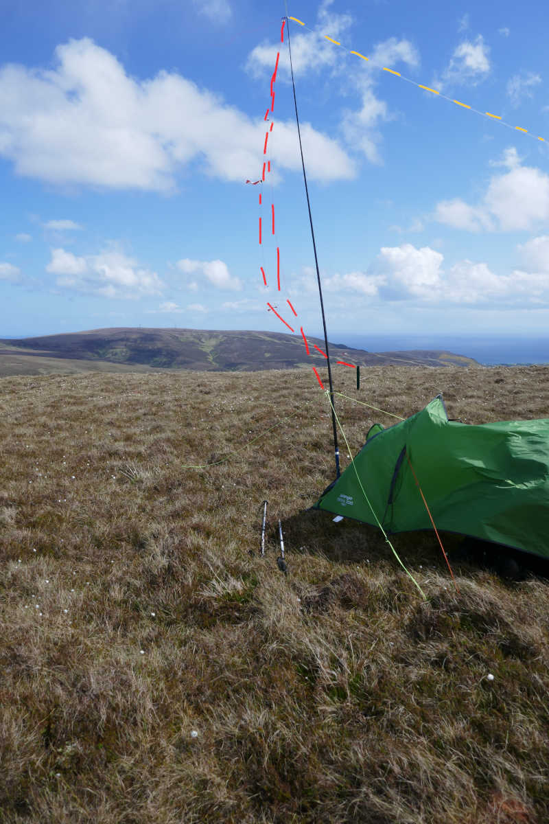 Like this. Antenna is setup as inverted L (inverted 7) running from the top of the 5m pole to about 1m up, from the top it runs out to a 1m pole in the distance. Highlighted with dashed red line in the pic. The top support is highlighted in yellow. Cnoc-na-Maoile GM/NS-134 in 40mph winds.