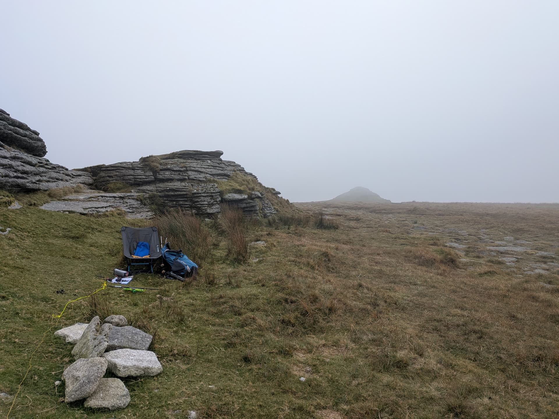 I normally set up on the east side of the summit but today the wind was coming from the east so I found a sheltered spot on the west side. There was a moderate breeze blowing but it did nothing to clear the air - I was in low cloud the whole time.