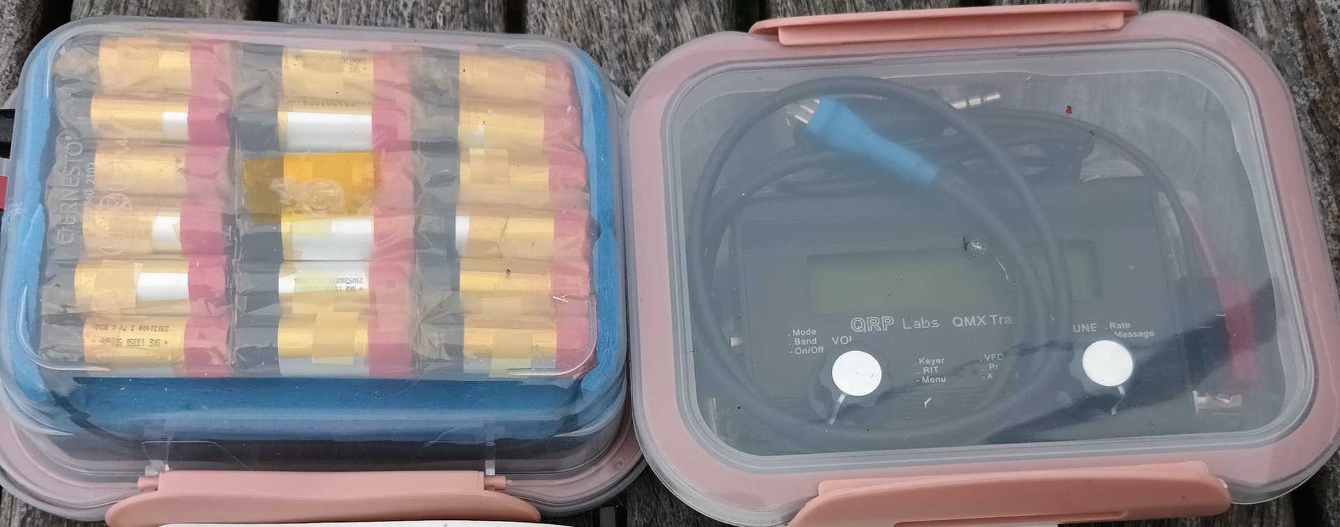 QMX with tiny home brew “junk box” microphone, sitting on battery box, 3AH nominal of recovered vape batteries: