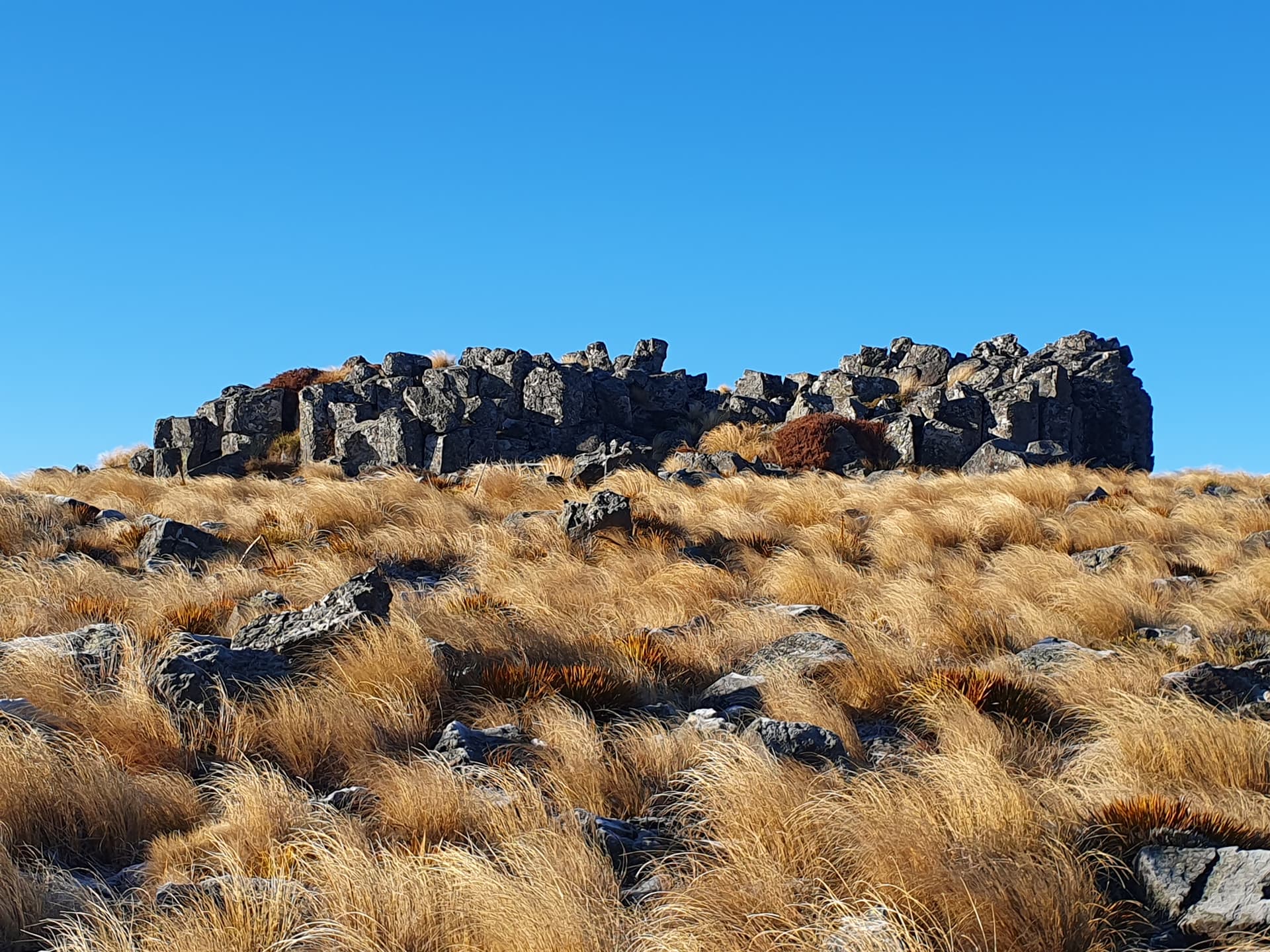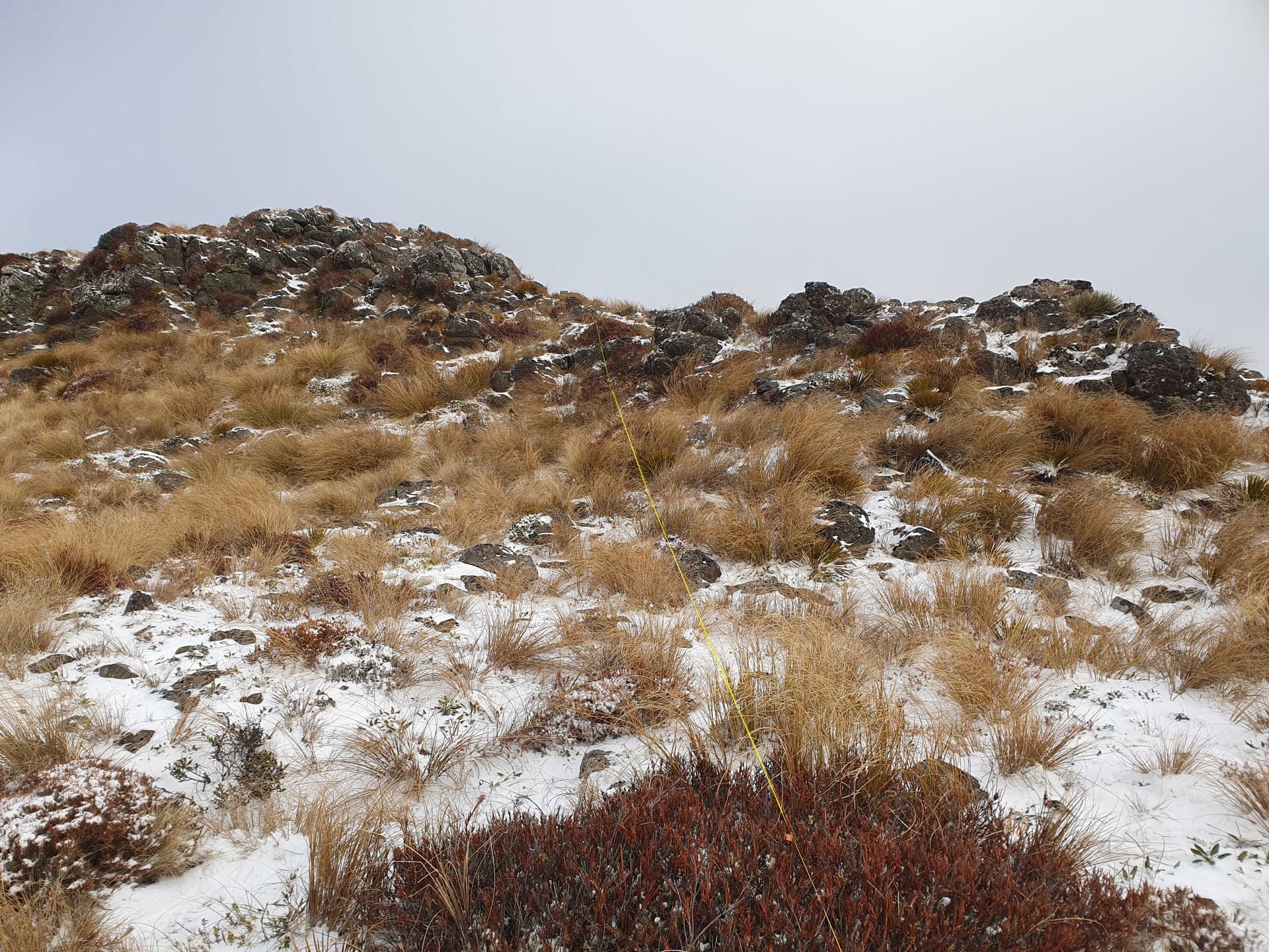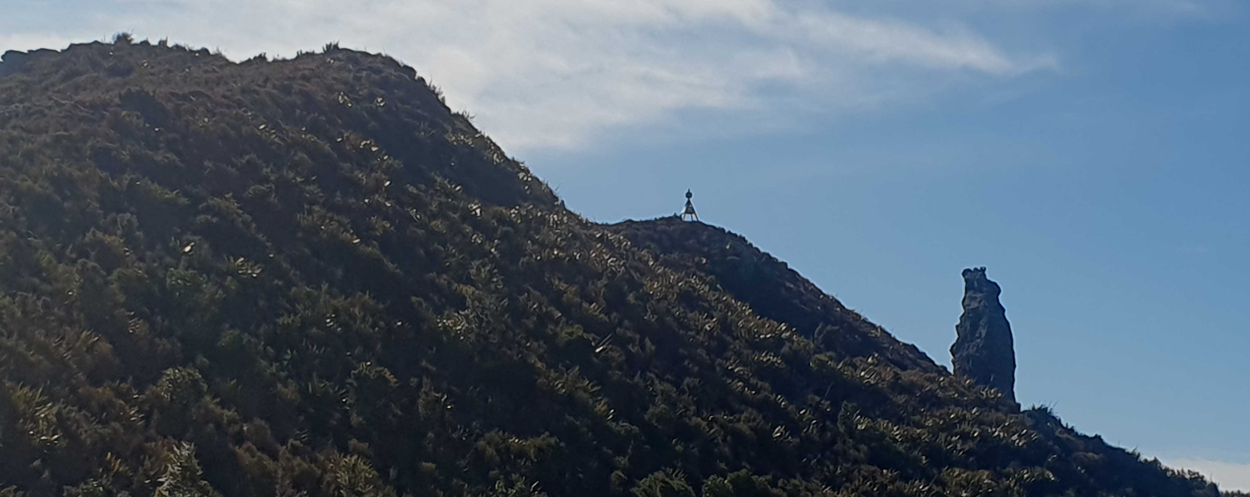 A council-owned reserve climbs the eastern flank of Hikaroroa / Mt Watkin from the road to its summit. From a distance the extents of this reserve are clearly visible: it’s that bright-yellow block of solid gorse amongst the otherwise tidy rough grazed pasture. We park up at an old quarry, and nose up the western fenceline - which is thankfully mostly still clear of gorse. There is no track, and it is a hard, slow climb up the steep loose volcanic rock through a mixture of roly-poly tussock waist-high scrub.