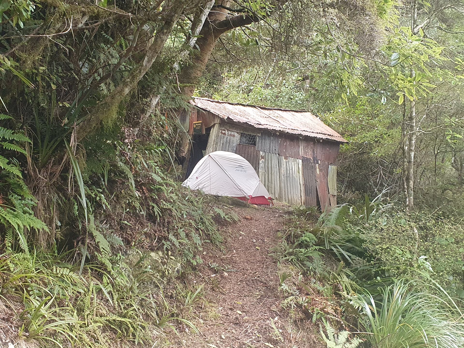 A sign above the door of Possum Hut states ‘Derelict Structure, Do Not Enter’. The floor is of packed earth, there are no beds and the roof clearly leaks in places, so I pitch the tent outside. But shortly afterwards unforcast, heavy, sleety rain commences, wind thrashing the trees above. I make the quick decision to pull the pegs and move the tent indoors. There are a few drips, but inside the tent we are warm, cozy and have a pleasant, quiet night.