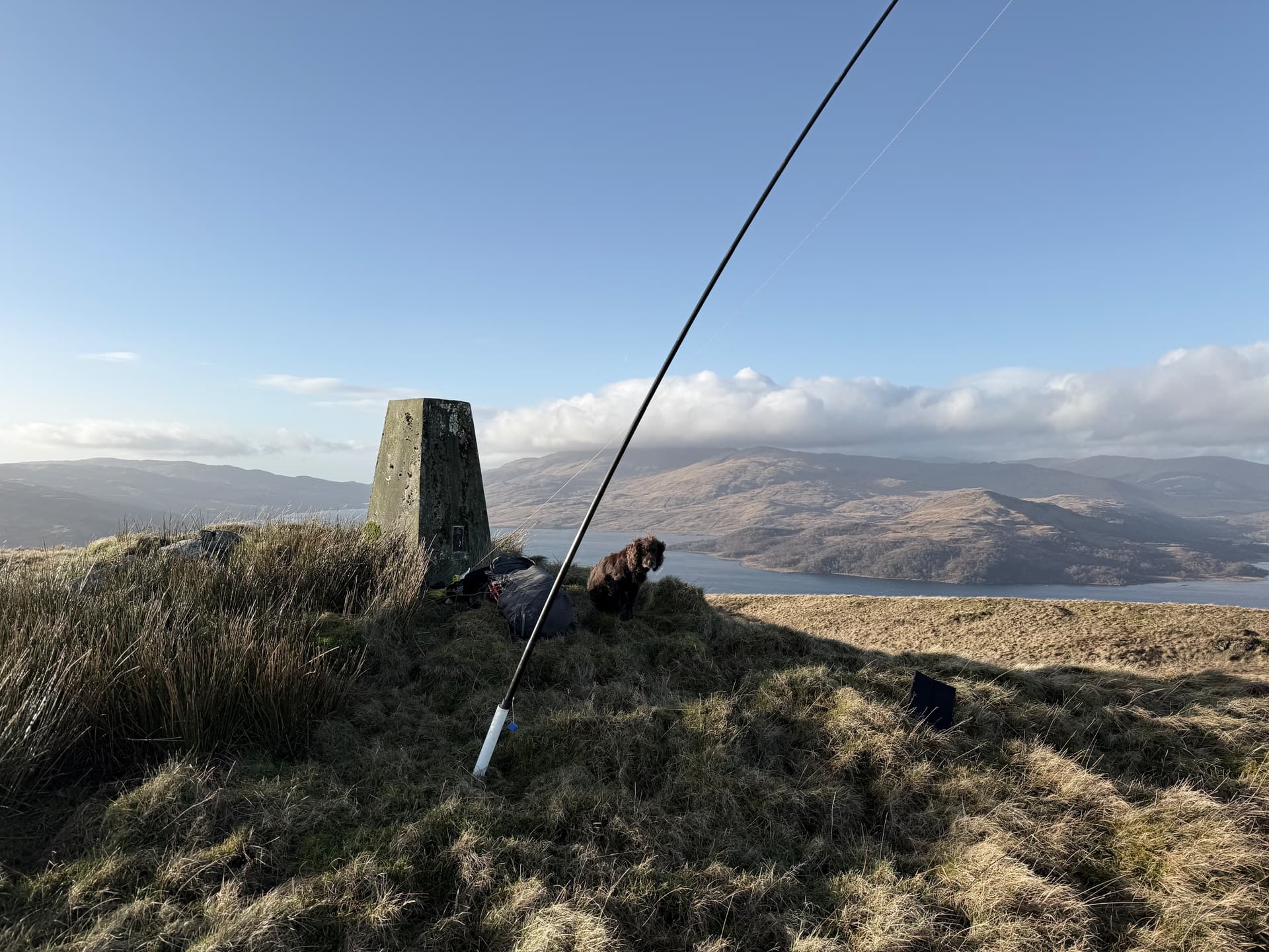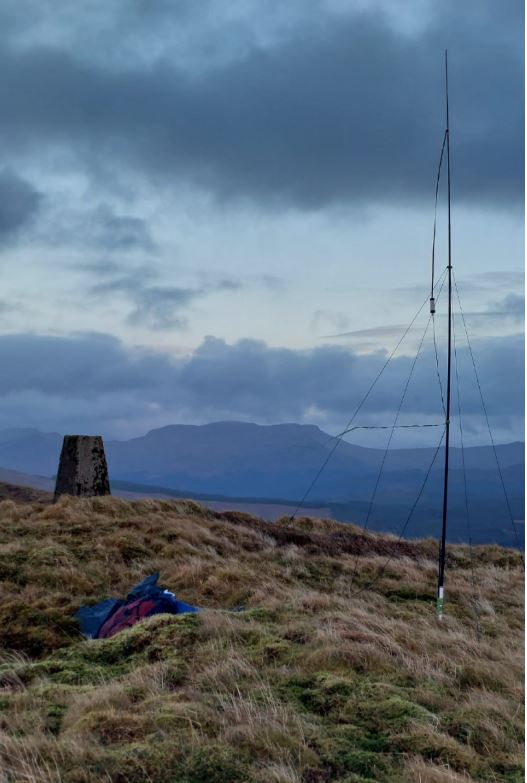 The summit of Cruach an Lochain has a concrete pillar trig point set on a grassy hill top with some boggy mossy patches nearby. I set up the mast and Slim-G away from the trig point, choosing not to stick the mast down inside the trig point as I reckoned it was a bit too windy; so avoiding snapping my Sotabeams mast again, like I did on The Brack GM/SS-040 ! ![]()