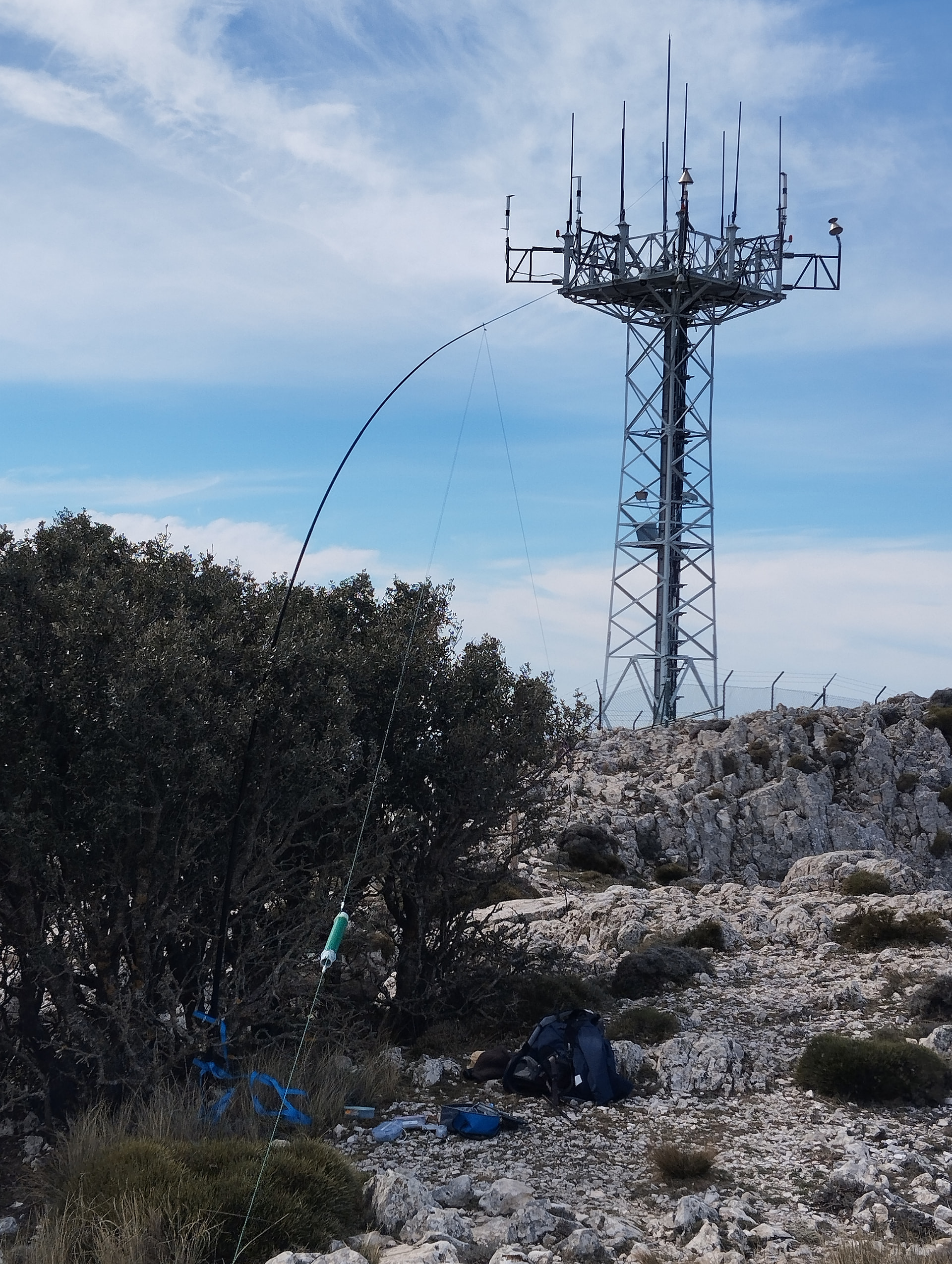 I activated EA5/AT-001 Aitana today for the first time (this was something I wanted to do long ago). The summit itself is inside a restricted military zone, but the activation zone extends outside the fence to the east. A patch of local evergreen oaks (“carrasques”, Quercus Ilex) at 38.6498, -0.2622 allowed me to attach a 5-metre fishing rod and an end-fed antenna, and I worked CW on 20 and 40 and SSB on 20: 36 QSO total.