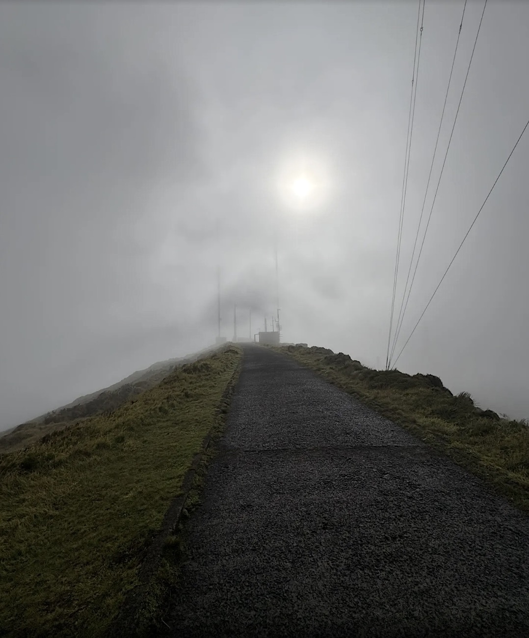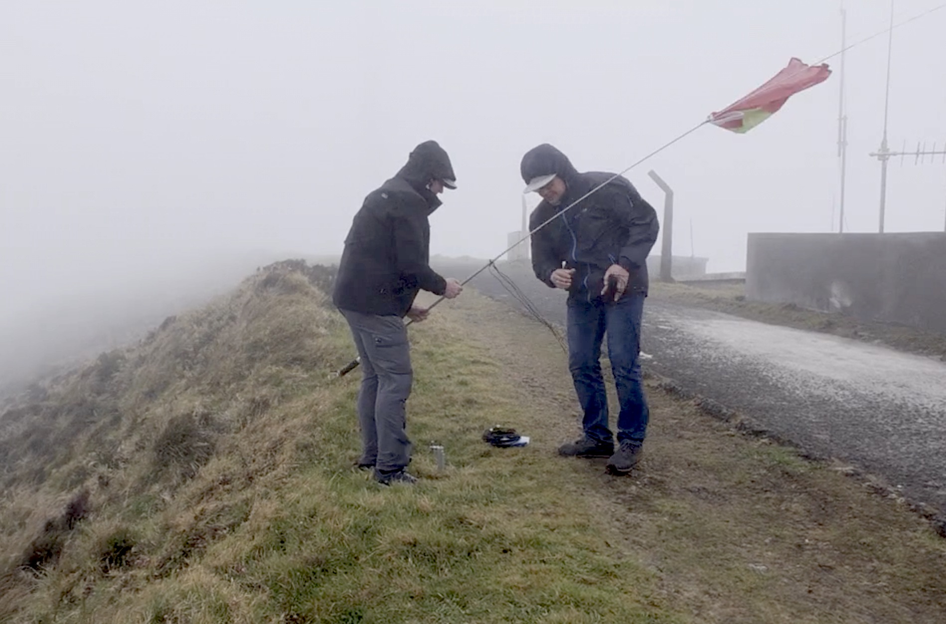 However, upon reaching the summit, our most pessimistic expectations were exceeded. A squall-force wind bending the 14 MHz dipole into an arc, constant drizzle turning into rain, cloud cover and fog hindering visibility and the view. All those elements we love so much about SOTA at significant altitude! ![]()