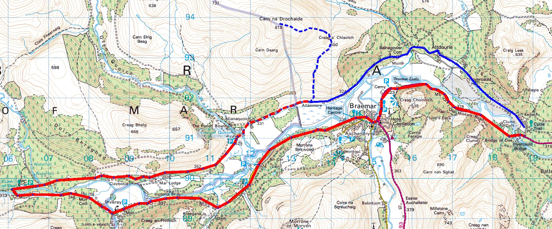 Unusually, I’ve only been up this one once - way back at the start of my SOTA lifestyle, in August 2021. From my end of Deeside, the drive to the parking involves a tedious trip up one side of the Dee, over a bridge, and then return down the other side. Now, if I could park at Keiloch and take my bike, could I get to the start of the hill path in less time than it would take me to drive? An extra 21km of driving and a 2km walk versus 6.7km of cycling.