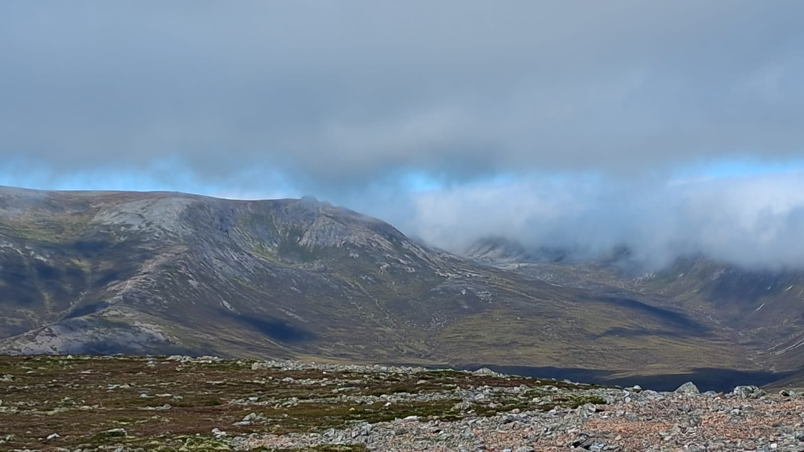 For a change, I followed a nice stalkers path around the north side of the hill, which revealed nice views down to Gleann an-t Sluggain, The Fairy Glen, site of The Secret Howff. It gradually rose and then faded out near the upper slopes. Cloud came and went. The wind was fresh and from the NE. Ben A’an and the northern end of Beinn a’Bhuird remained int thick cloud. Alex might be without a view for the second time up there…