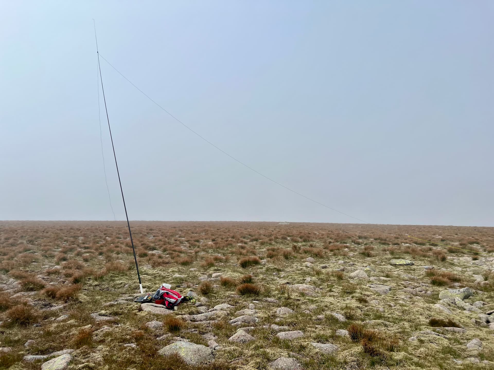 I kept seeing Fraser’s spots come in, and whilst he hadn’t plan to hang around for my second summit, I managed to get to the AZ whilst he was packing up. Simon, GM4JXP, was quick off the mark again on 2m, then I continued up to near the cairn. Still in the cloud it took a while to spot, and I setup nearby.
