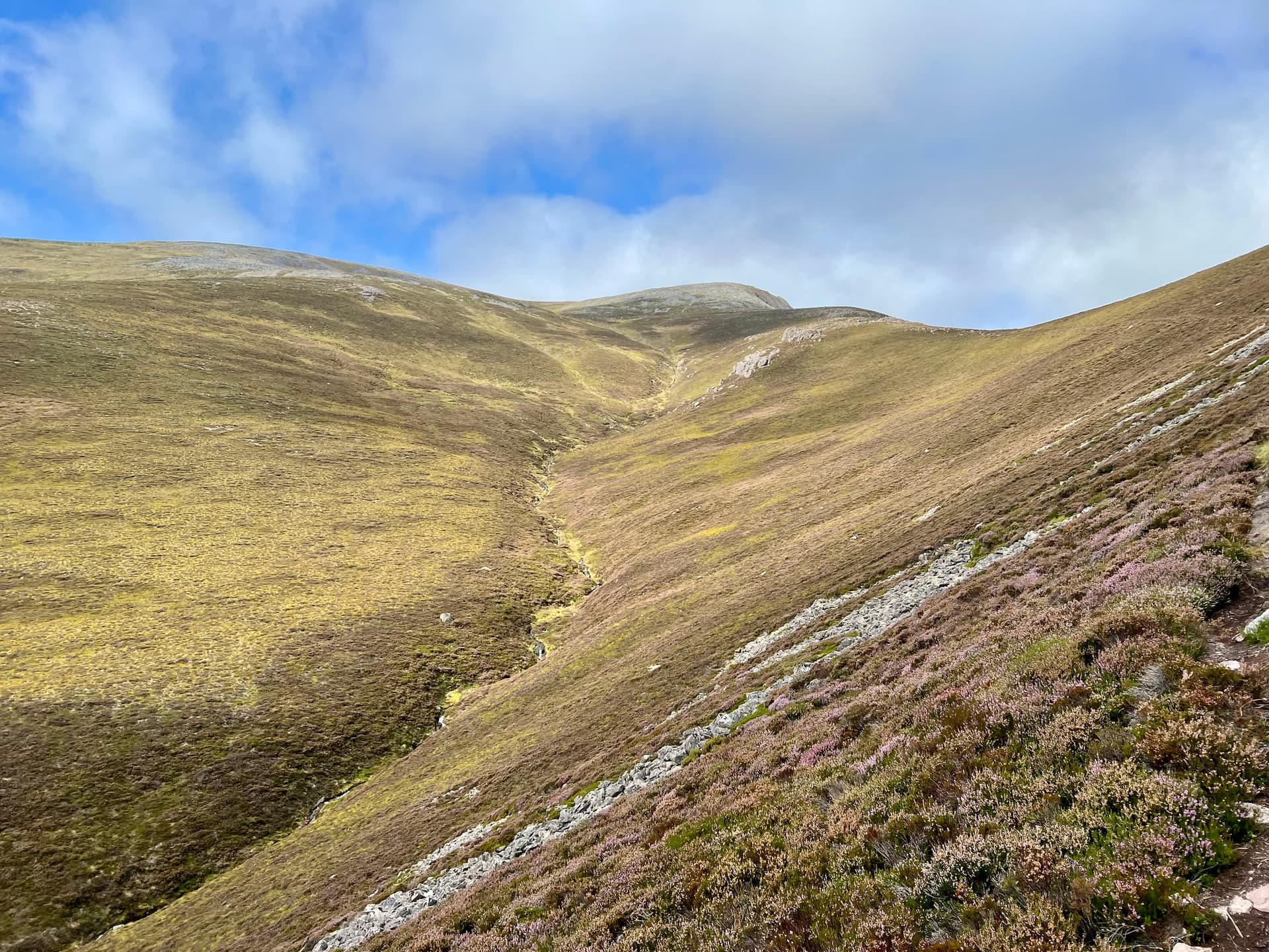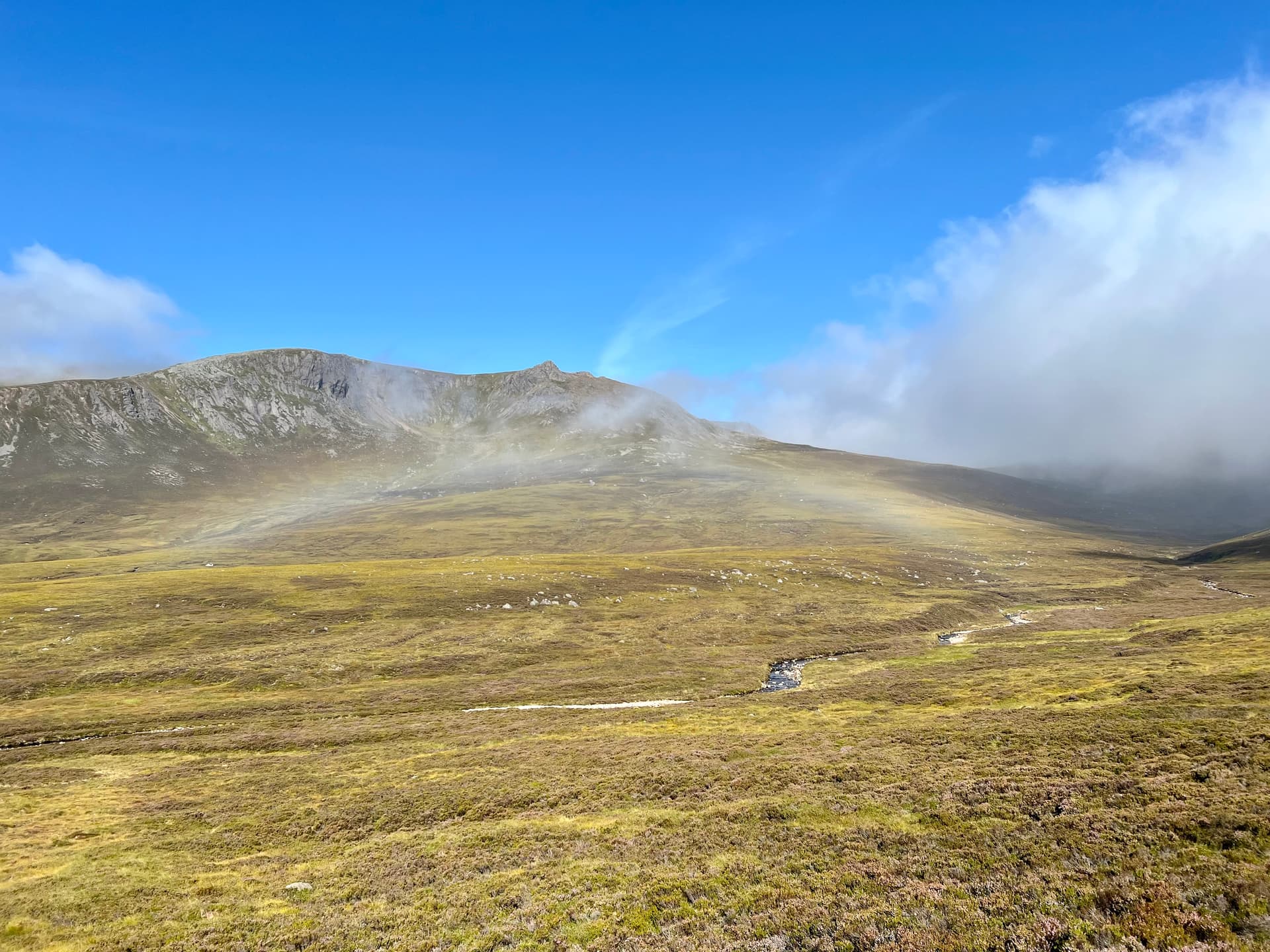 After a grey, damp cycle up the Slugain, I was greeted with lovely blue skies and sunshine, and then even a rainbow when looking across to the south top. The cloud was lingering on Ben Avon but I was hopeful it would shift…well it didn’t.