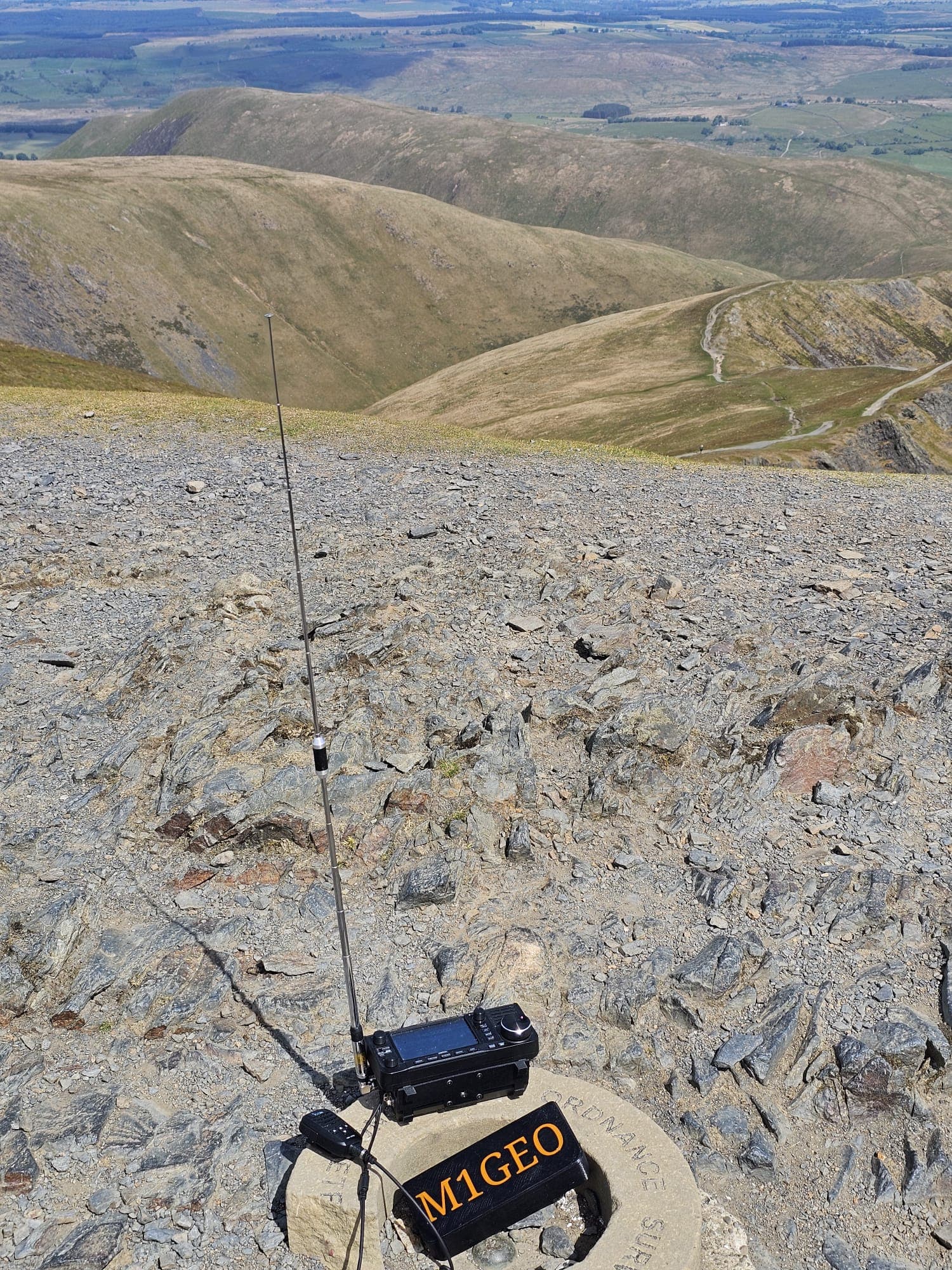 I called out CQ on 2m using my FT70D and RH770 at 1908 BST, and M0TLX was first and only to respond. I looked around on the band and heard M7RFB in a QSO, since I had spoken to him earlier in the day from the summit of Great Shunner Fell, I interrupted his QSO and asked if he would kindly work me again. This gained me two further QSOs (M7RFB and 2E0FAU) along with a very pleasant chat for 10 minutes. No further stations were heard on 2m, and so I moved onto HF CW. Satisfyingly, the central pipe of the trig point was open, and provided a most excellent support for my telescopic pole, allowing me to speedily set up for HF CW. First to respond was ON7ZM as my fourth contact, followed by ON7GO and DP5XL. I find chasers become quite sparse about tea-time, and today was no exception, with DP5XL being my final contact. With Hoove now activated I had completed G/NP.