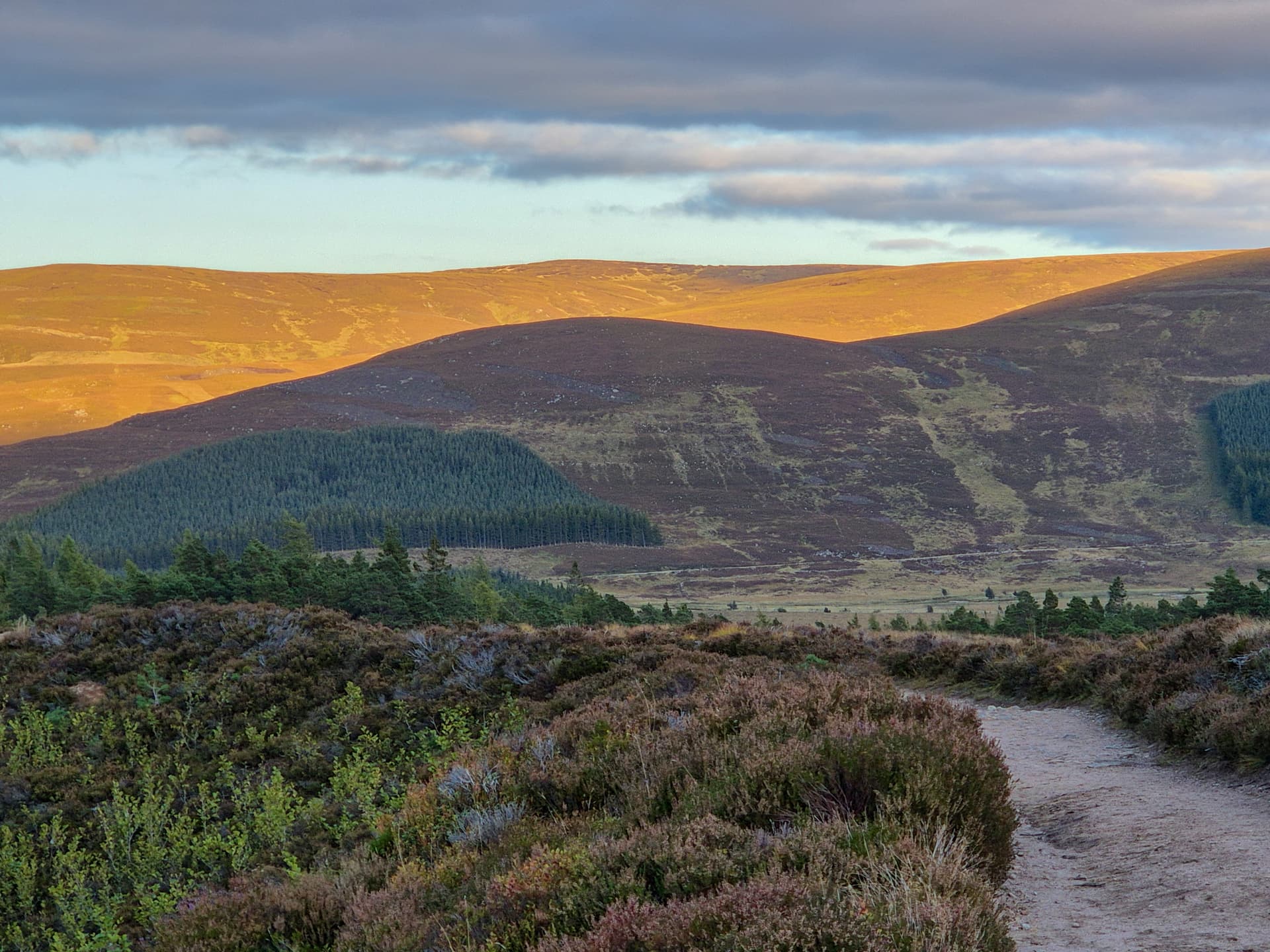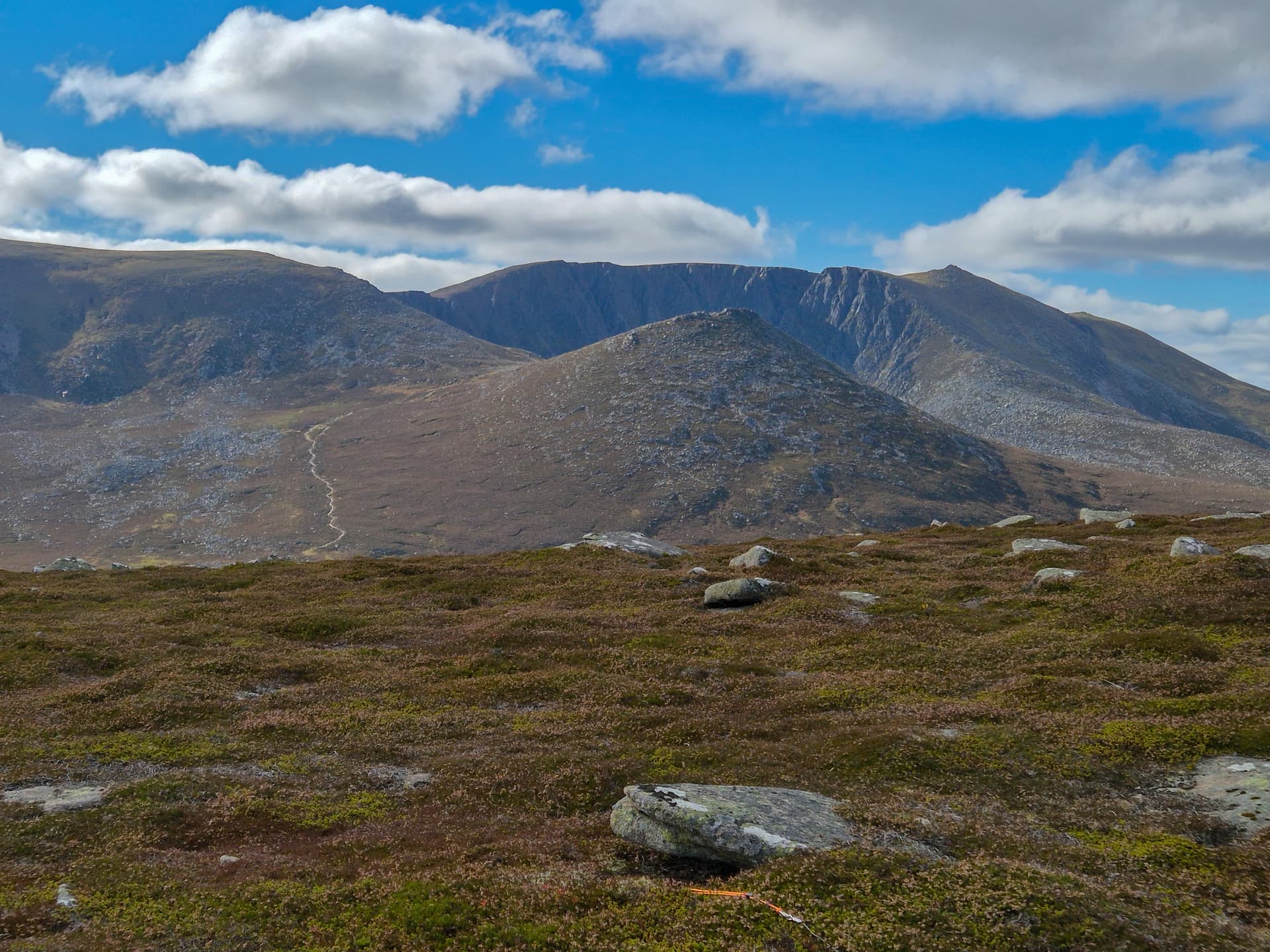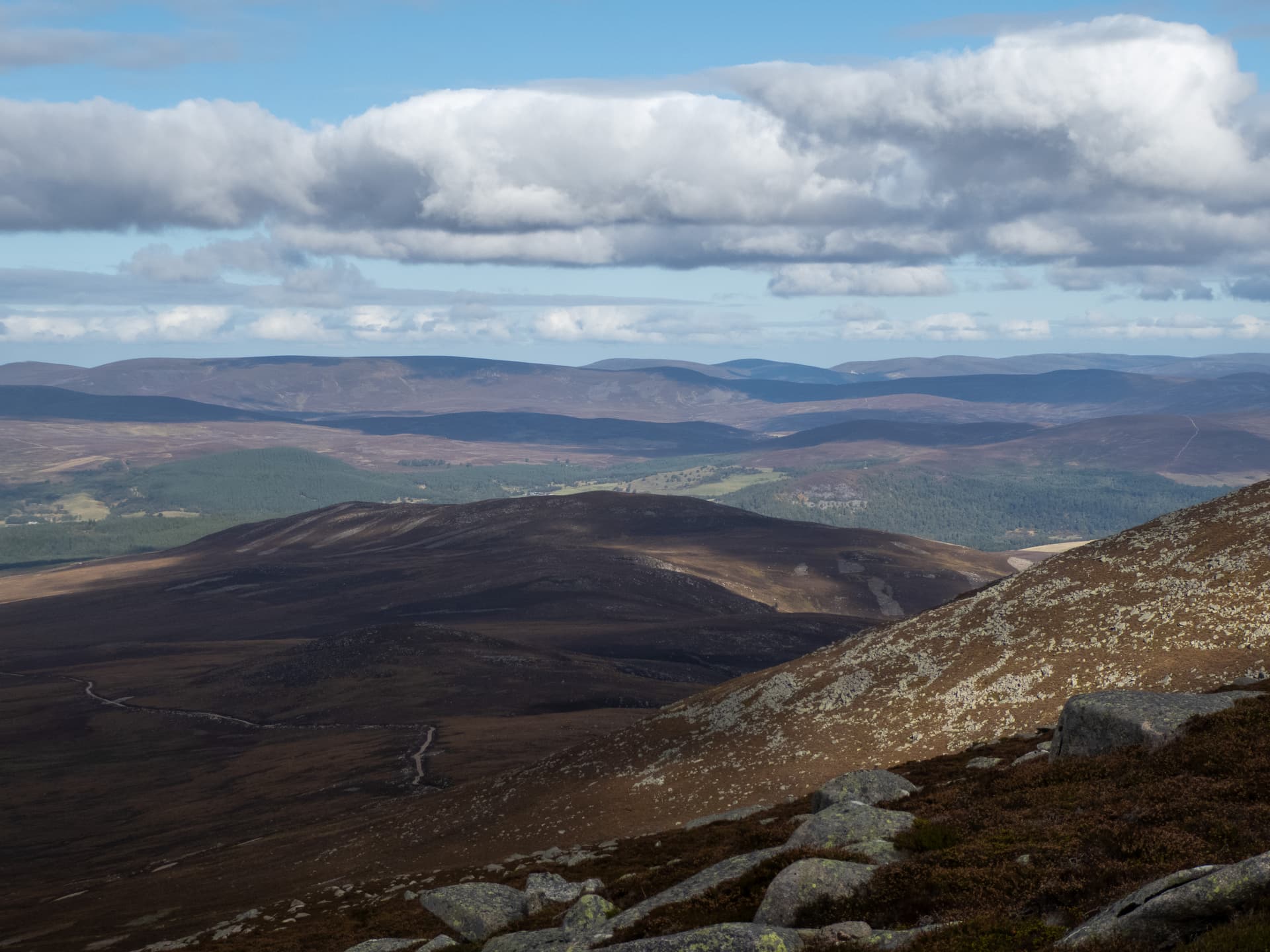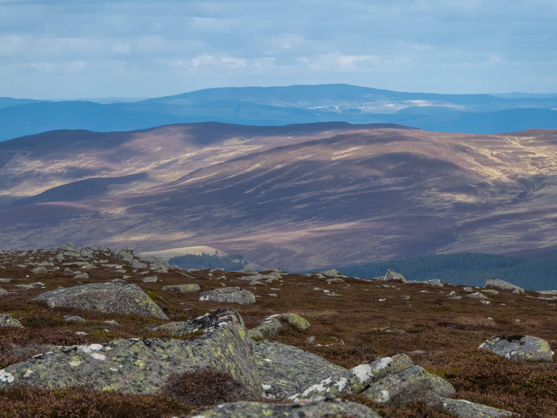 The summit is flattish, with some small granite tors and a decent view of Lochnagar to the West.
