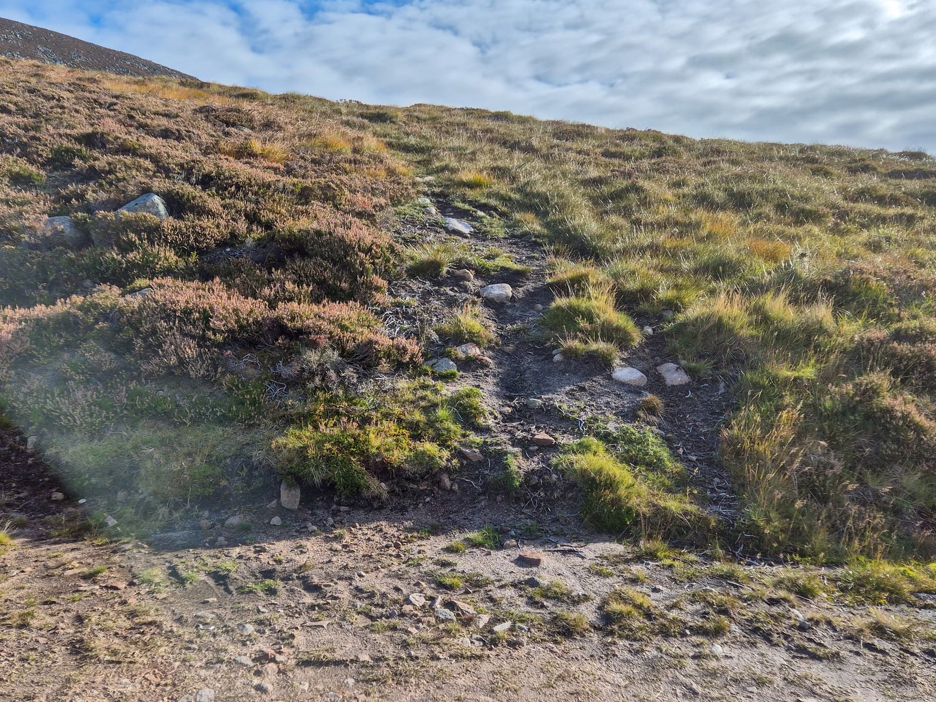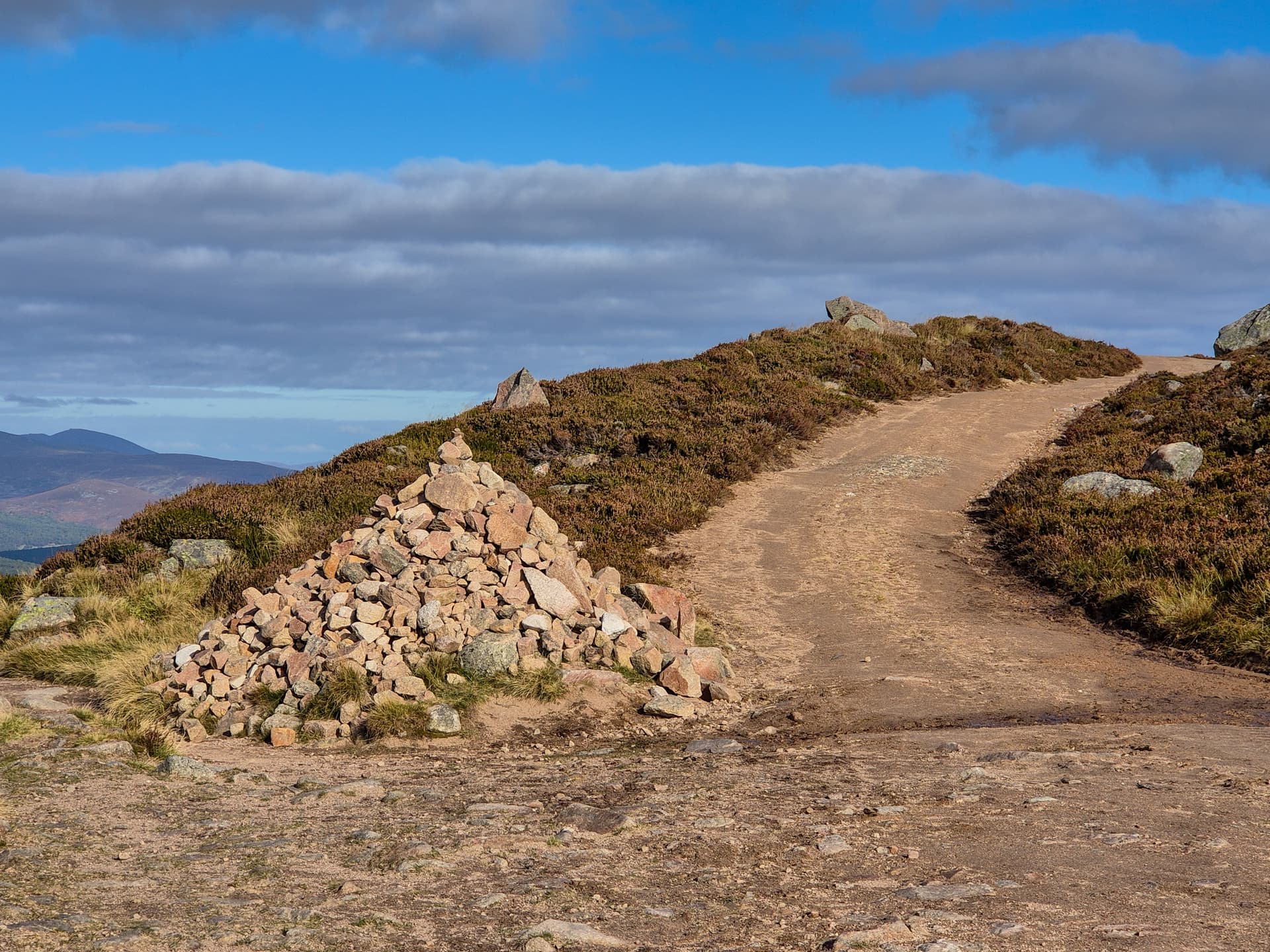 The Lochnagar trail is signposted and its about a 1 hour plod up a decent atv track, if rubbly in places. The section approaching the turnoff for Conachcraig has been resurfaced recently with compacted silt and gravel to superhighway standard compared to most trails up here. The turnoff point is marked by a large cairn.