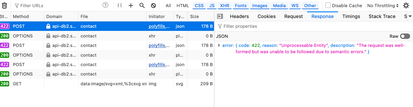 Your contact endpoint https://api-db2.sota.org.uk/contact is returning 422 Unprocessable Entity . This impact is people cannot contact you via https://www.sota.org.uk/Contact