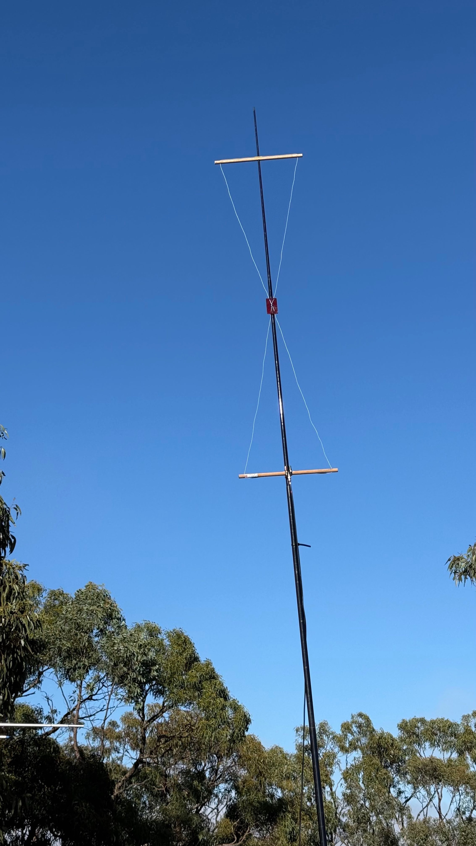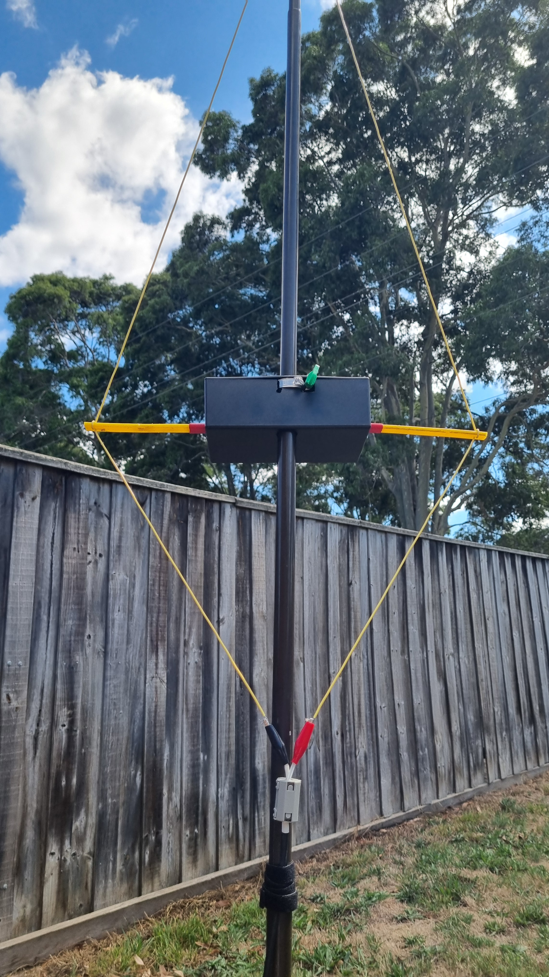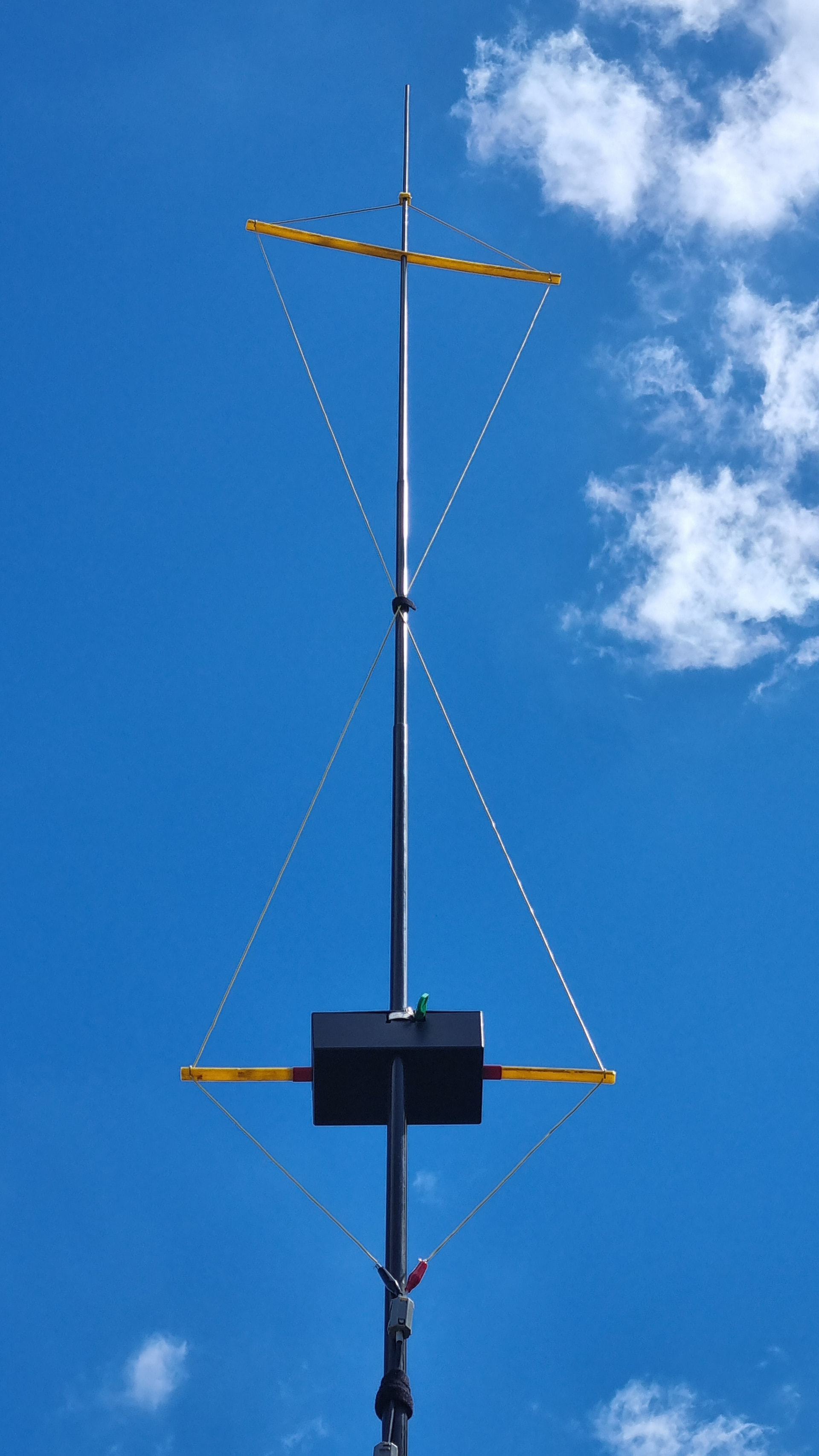 Then you need a support to hold the two loops apart, about 600mm apart. That gives a total length of 1.8m, plus a bit for a handle, mounting, etc. Ideally the antenna would be mounted with the bottom about 2m above the ground. Both loops are mounted with the feedpoint towards the center, and fed in phase. You can hang the whole antenna from a rope tied to the top if you add some additional ropes between the elements to take the tension off the feeders. Or arrange some sort of clips to attach the horizontal spreaders to the side of your telescoping mast.