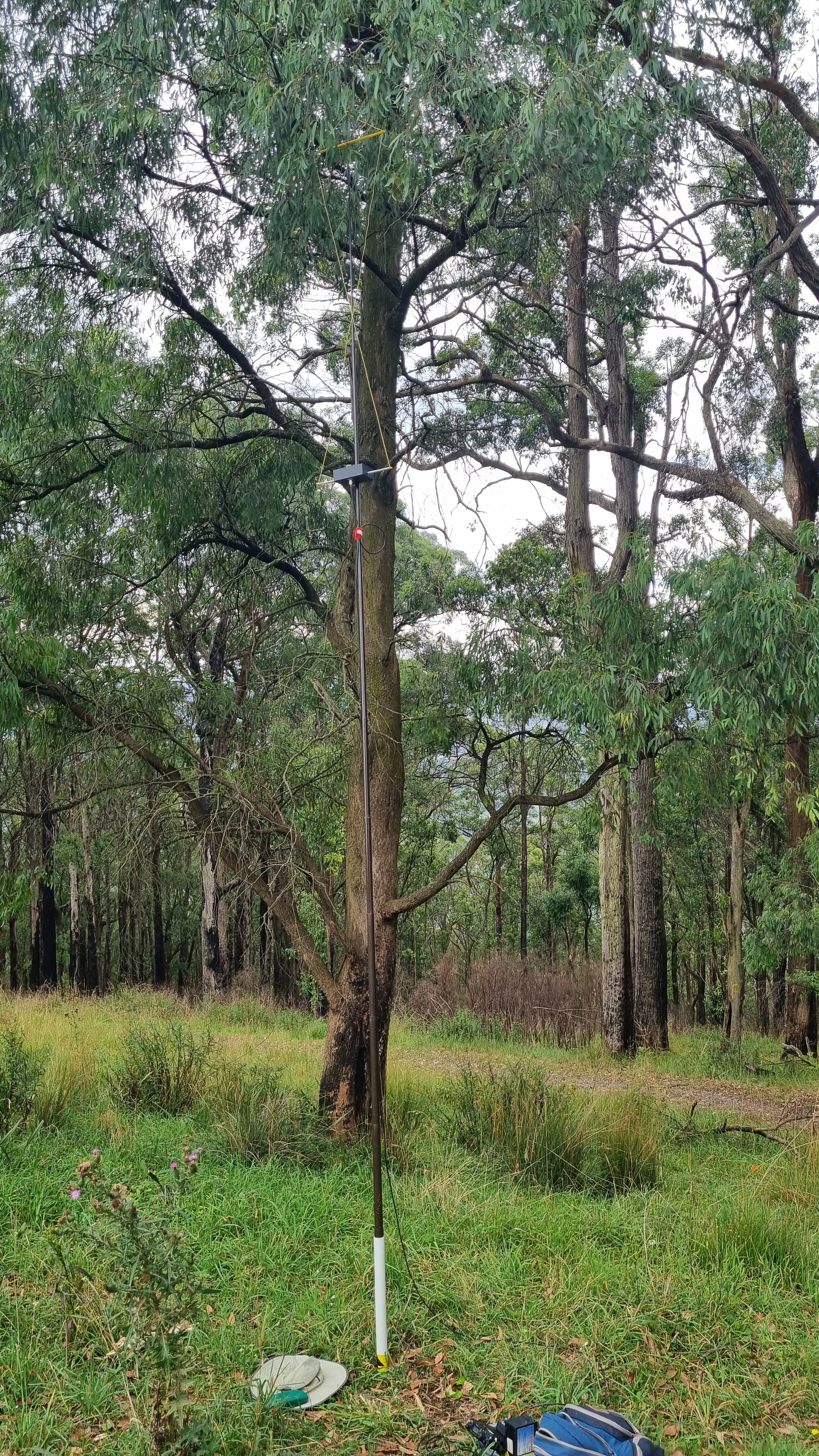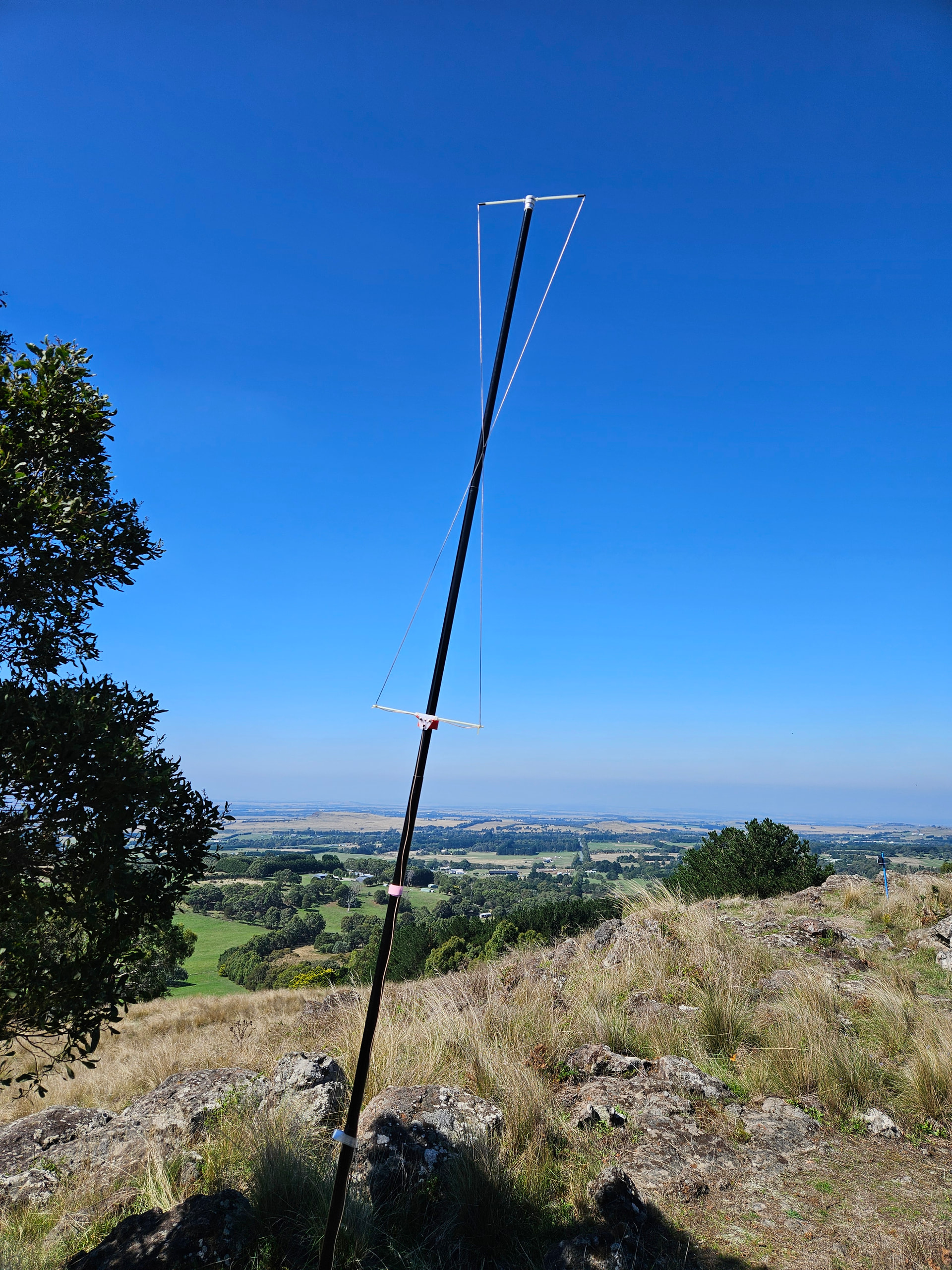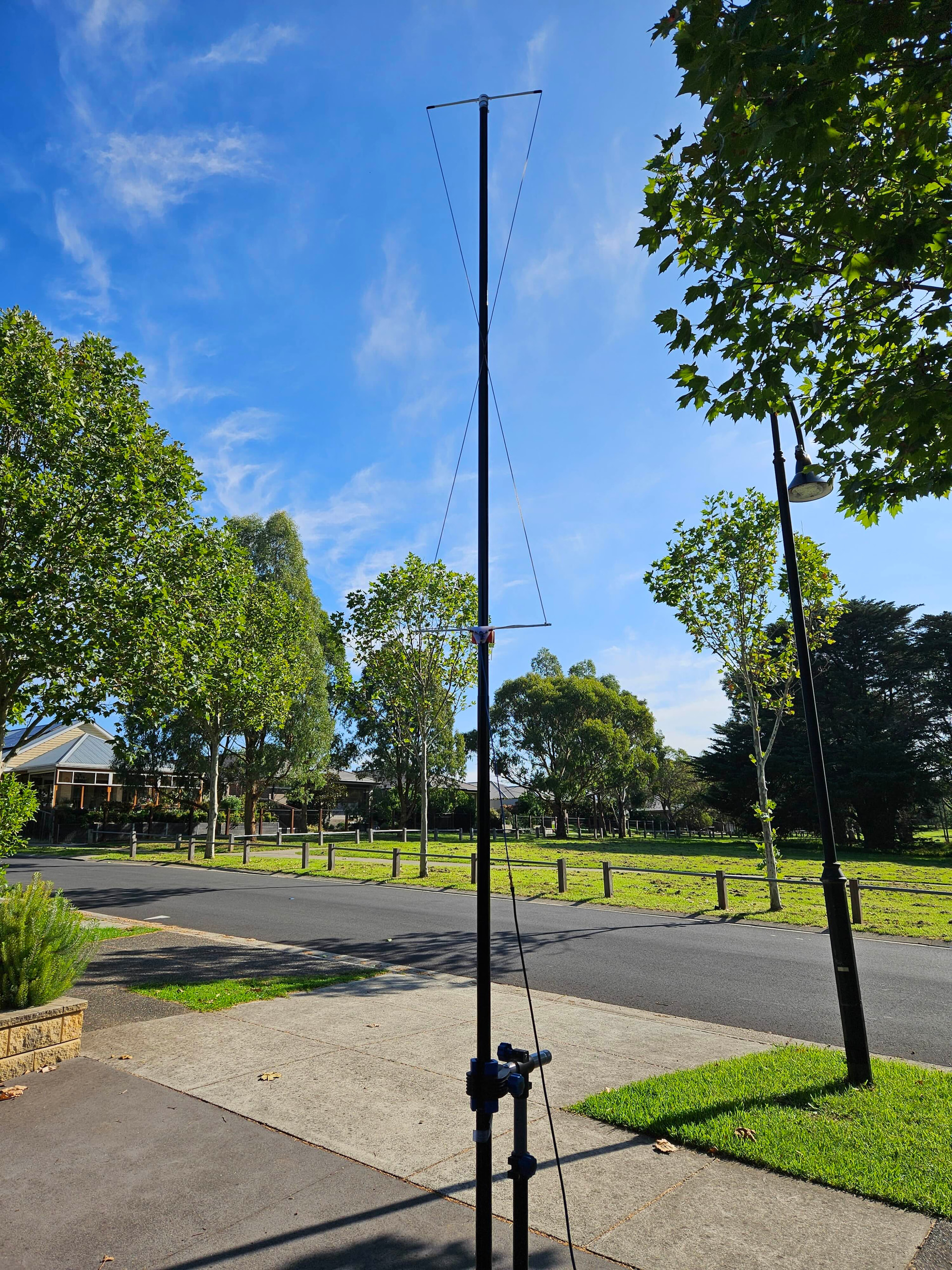Then you need a support to hold the two loops apart, about 600mm apart. That gives a total length of 1.8m, plus a bit for a handle, mounting, etc. Ideally the antenna would be mounted with the bottom about 2m above the ground. Both loops are mounted with the feedpoint towards the center, and fed in phase. You can hang the whole antenna from a rope tied to the top if you add some additional ropes between the elements to take the tension off the feeders. Or arrange some sort of clips to attach the horizontal spreaders to the side of your telescoping mast.