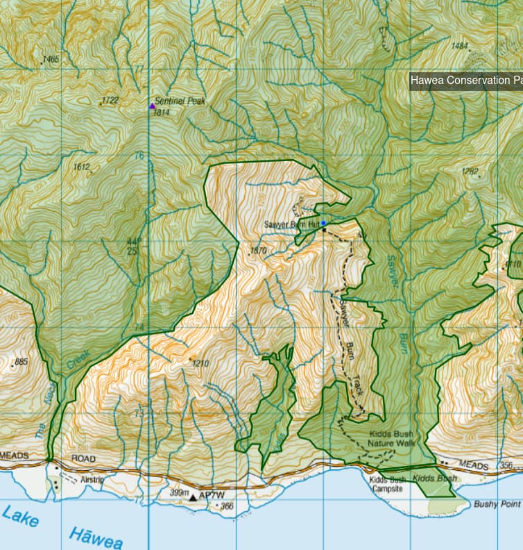 So, pre-empting that I turn left at The Neck and head along the gravel road to Kidds Bush conservation campground for a more tranquil climb of the 1814m Sentinel Peak. Just 14m inside the 8-point band, and again accessed from the 400m shore of Lake Hawea, it should be a nice easy climb even for someone in my current state.