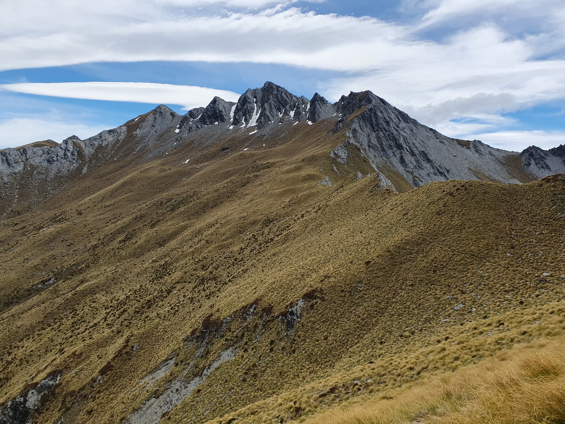 Both the false-summit 1km short of the top, and the summit itself are bypassed to the south on tussock faces below steep crumbling bluffs, on a vague ground trail. A brief scree scramble between the summit and it’s western neighbour leads to a stony saddle and gives access to the northern tussock face which can be scrambled back east to the summit.
