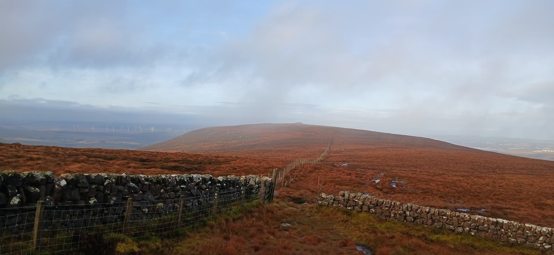 I didn’t go as far as Cauldstane slap before branching off up the hill. This takes you up to a large cairn which isn’t the summit. At this point the cloud came in and obscured things but the path across the boggy ground was clear enough to follow beside the fence.