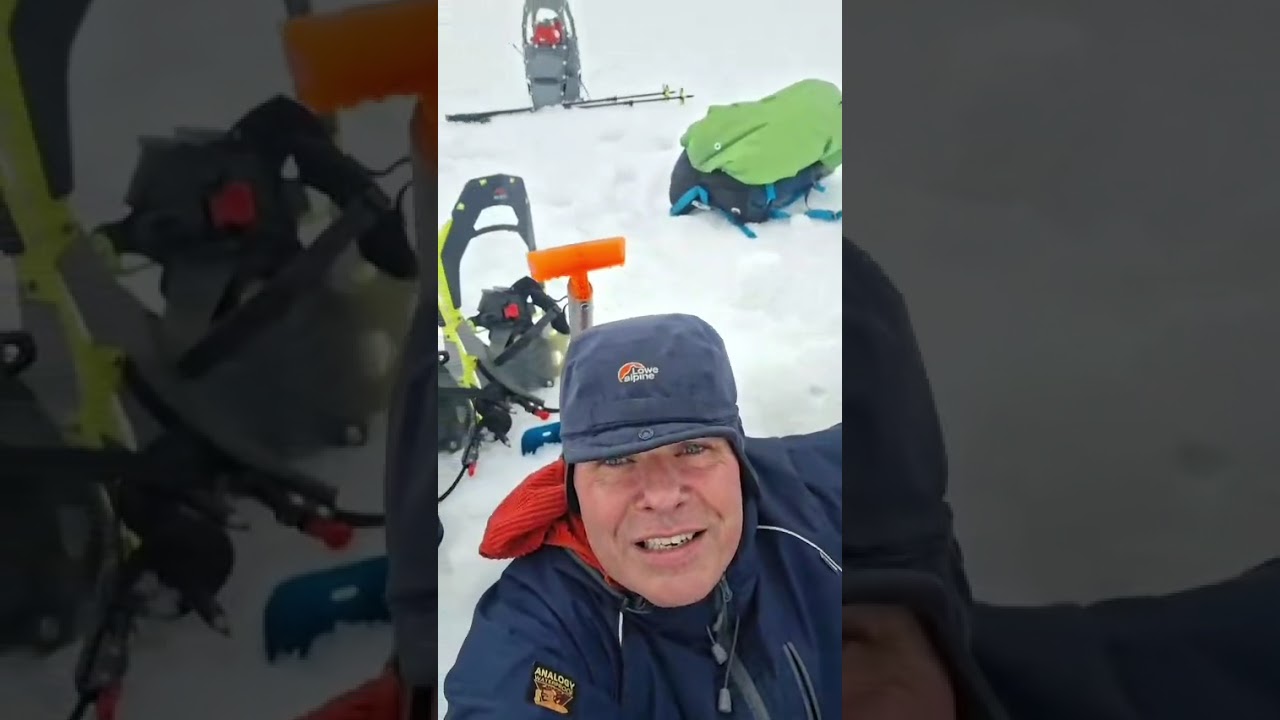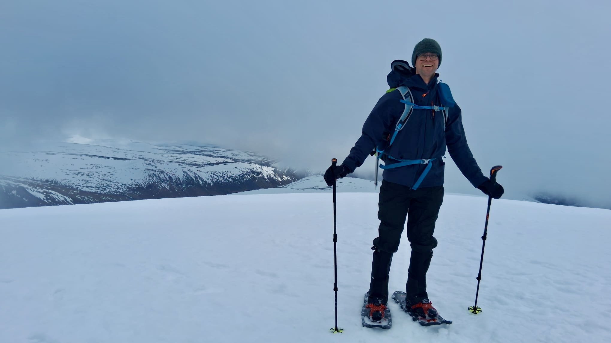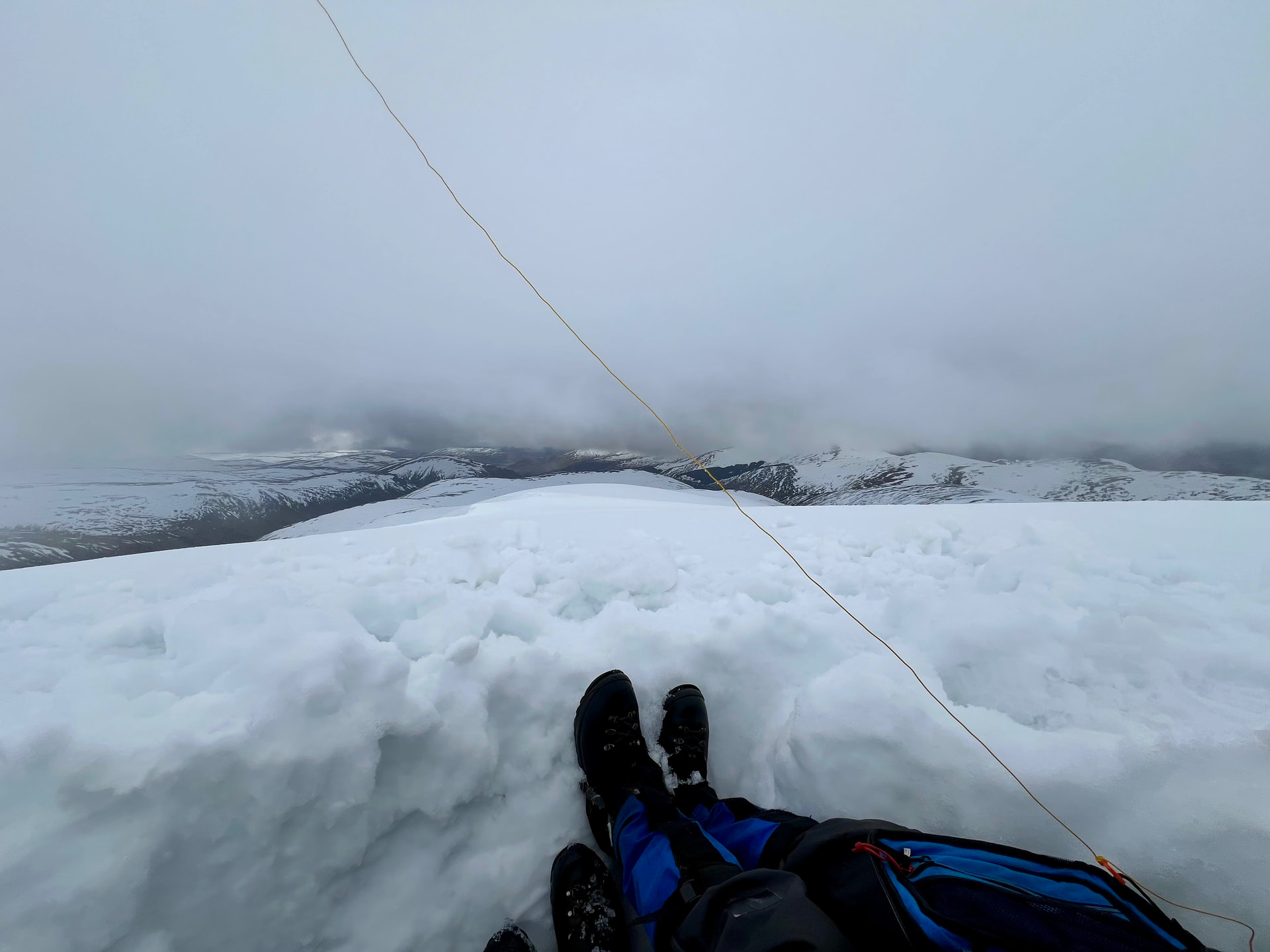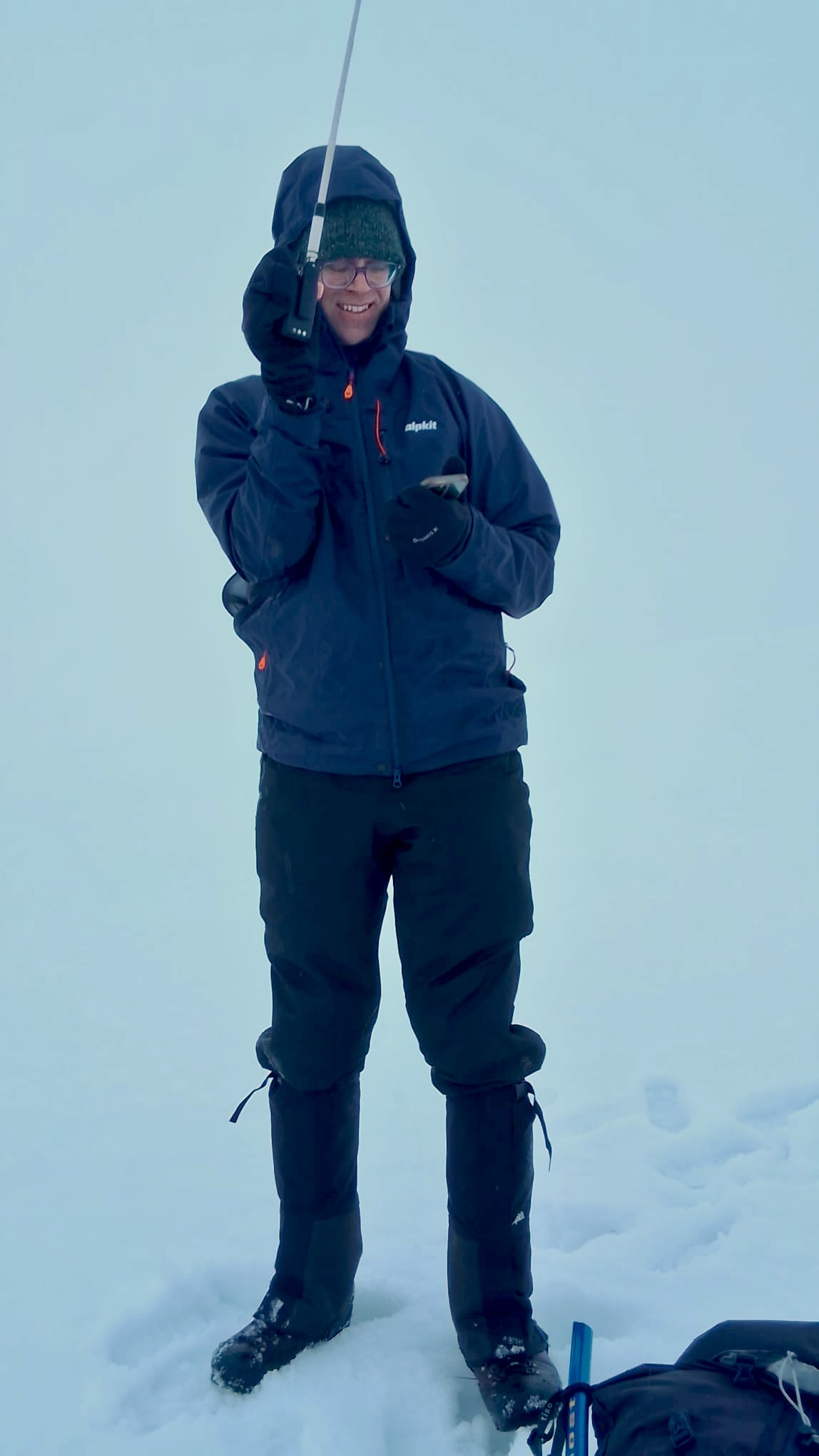 In the cloud at the top, it’s white ground and white skies, and we walk towards the summit looking for the trig. Then we see the edge of the cliff…hmm… checks map…yep we are standing on top of the trig and it’s buried in at least 4 ft of snow!