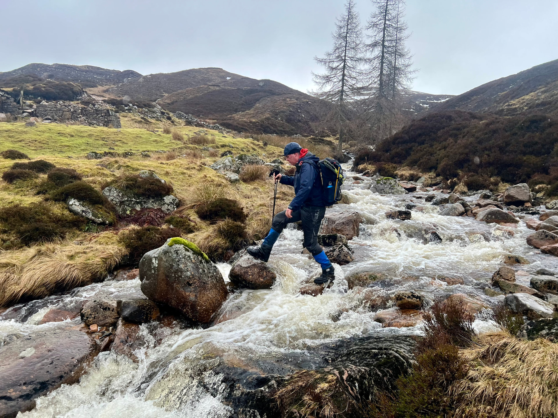 We caught up with a group who were looking for a place to cross the stream by Glenlochsie lodge ruins. Whilst they searched 100m of bank for a suitable crossing, we pressed on and went straight over.