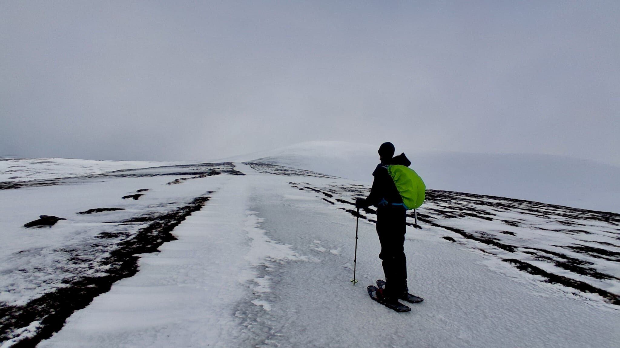 It had started raining when we set off but that had moved on, so whilst not blue skies, it was reasonable weather, with some breeze. However, the higher we climbed the stronger the wind got. Somewhere before 600m, it was time to don the snow shoes, and float our way up over the snow.