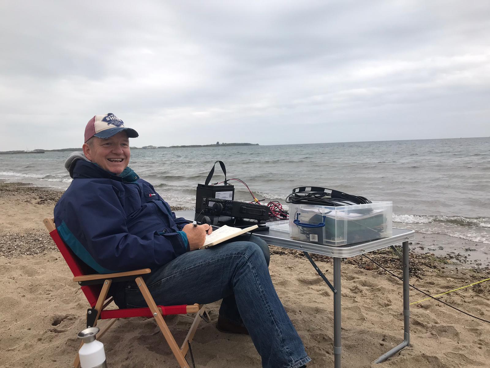 I am sitting on a stump. On the left knee the smartphone, on the right the logbook and the kx2 with the microphone and paddle up on the lap.