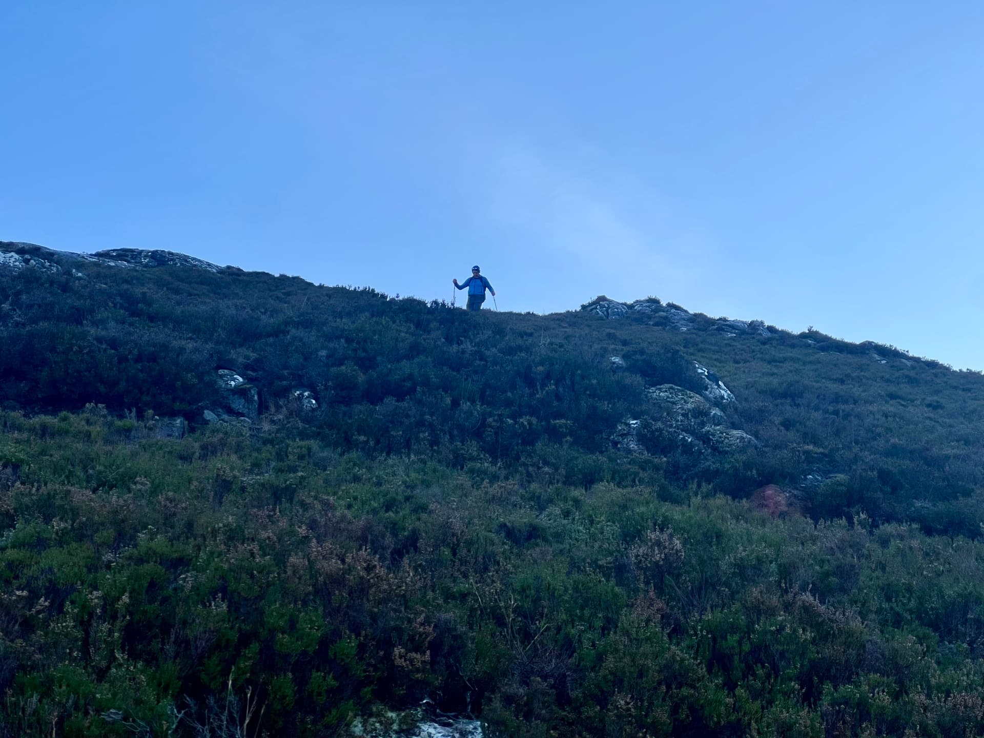 We pretty much took a straight line route towards the summit, descending from 911m to 450m and then starting the steep climb up the other side. We’d spotted a fence line on the map and so followed that up, but this was a four legged climb up the scree.