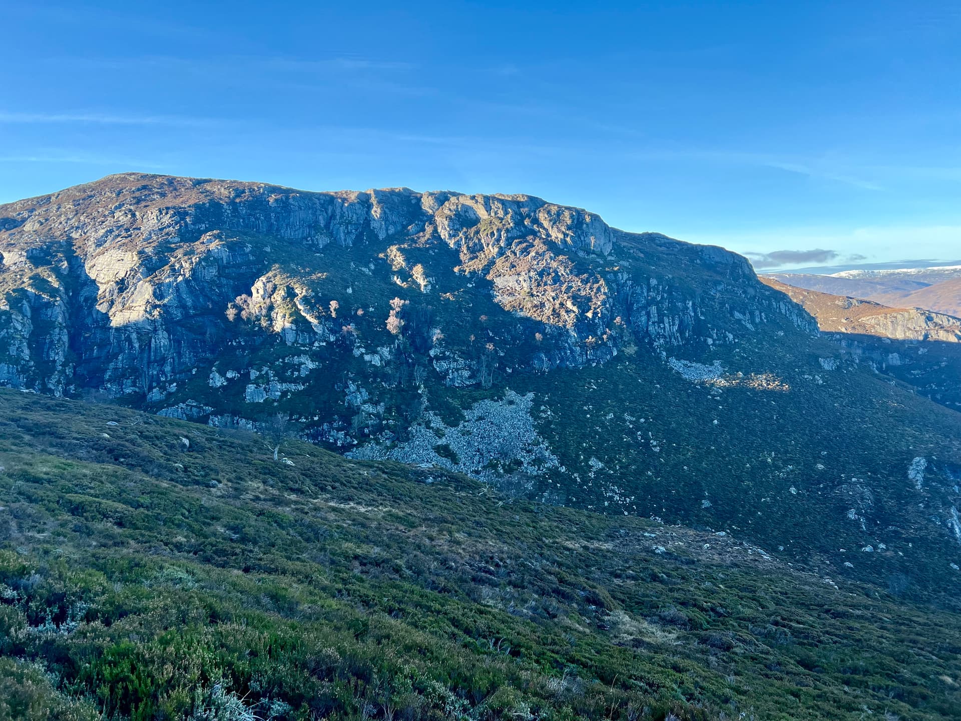 The day before I called into Aldi on the way home from work, but I only had my jacket pockets (on my bike) so no mince pies today - they wouldn’t fit - but instead a nice brick of Aldi Christmas cake expertly sliced with Fraser’s swiss army knife - finally using the christmas cake blade in it. On the way up Fraser had pointed out Meall nan Eagan, GM/WS-247, and the heather bash him and Mo had done back in March this year. As we had time, and it’s a CNP summit I’ve not done, he submitted to climbing it again. So aff we ging than!