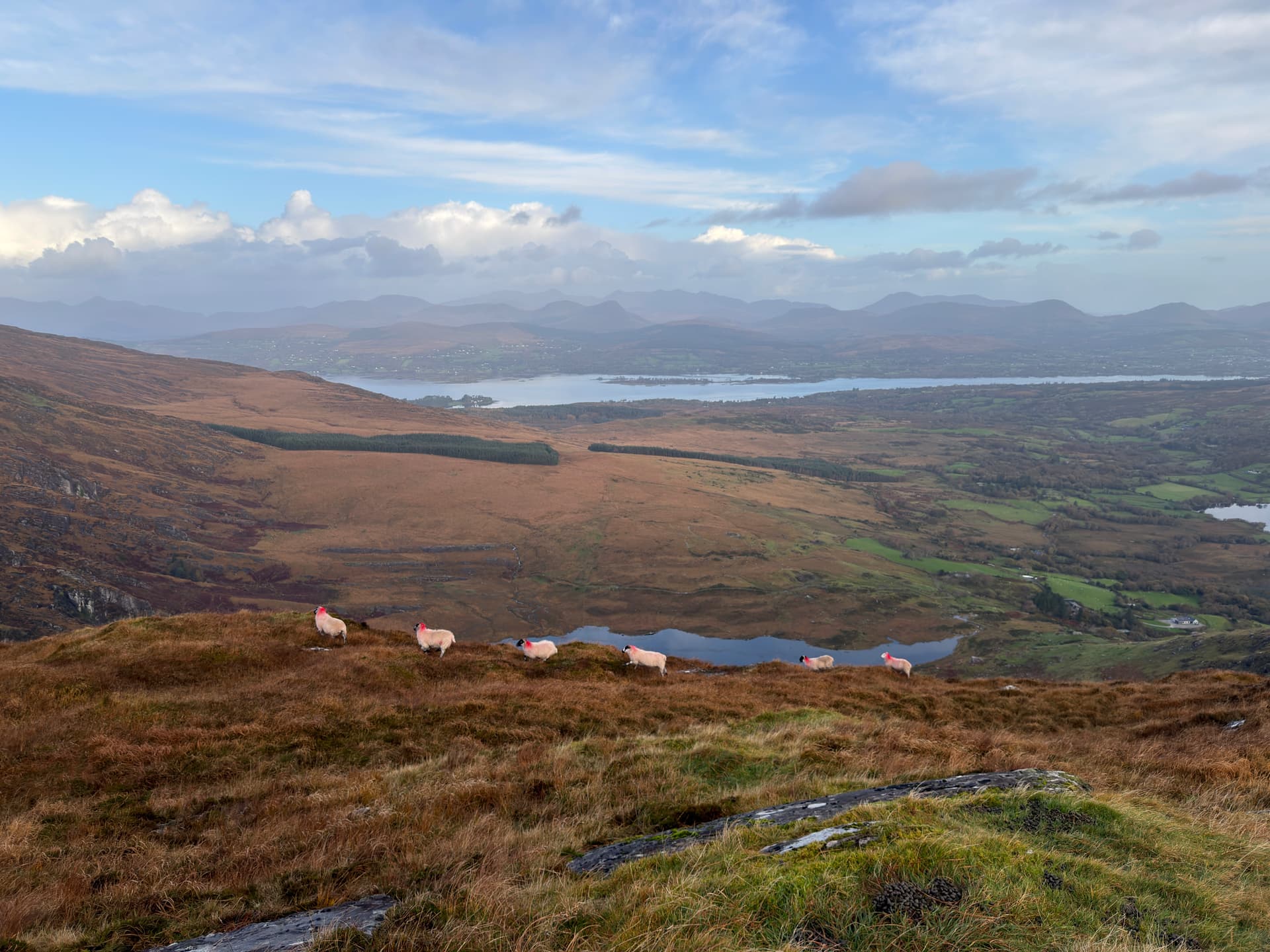 This was about to be the first activation of Knocknagorraveela, the Hill of Midges (or the Hill of Mosquitos, or the Hill of Gravel – I found these translations in an old Irish newspaper). Whichever translation you pick, it is puzzling, because there were no midges, mosquitos, or gravel anywhere during my hike. In any case, since this was the first activation, obviously no trail had been registered on sotl.as. But the worse thing there were also no trails in the AllTrails app for this hill, and the Hiiker app only had one which did not look curated (the route lines were too straight). I had to plan my own trail based on satellite imagery. That imagery was deceiving; what I thought was barren rock in the upper parts of the hill turned out to be yellow grass. Along the entire route there are two fences which I had to cross. But really the only slightly challenging part was the gully at 51.811653, -9.608188. I chose to walk up the stream to avoid the heathers, but next time I’ll climb on the heather sligtly to the right of the stream – the stony brook got very steep in a few spots and I had to scramble there. Once I was past the gully and some tall grass which followed, I walked right (north) along the edge of the pine grove which is visible there on maps and satellite photos. In a few minutes I reached what is called Knocknagorraveela North East from which the views onto the Kenmare River and Iveragh mountains were spectacular.