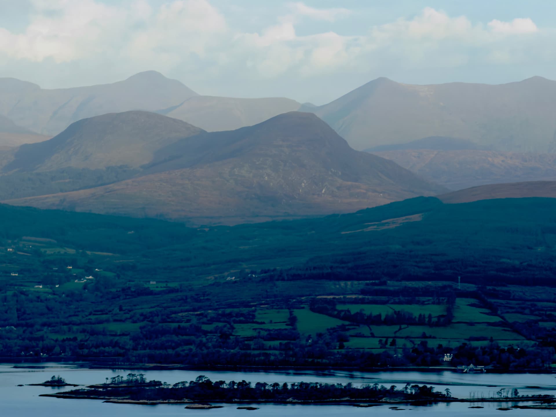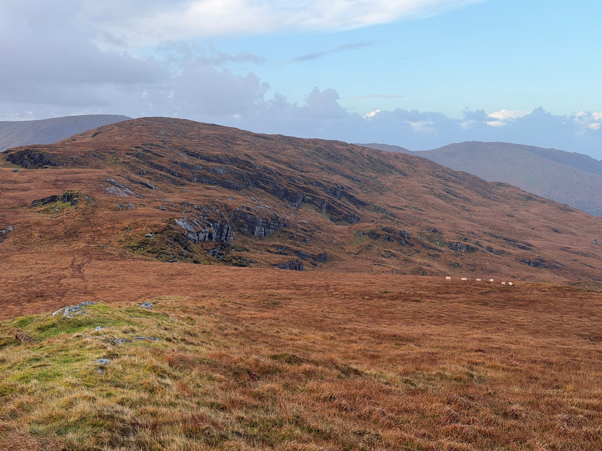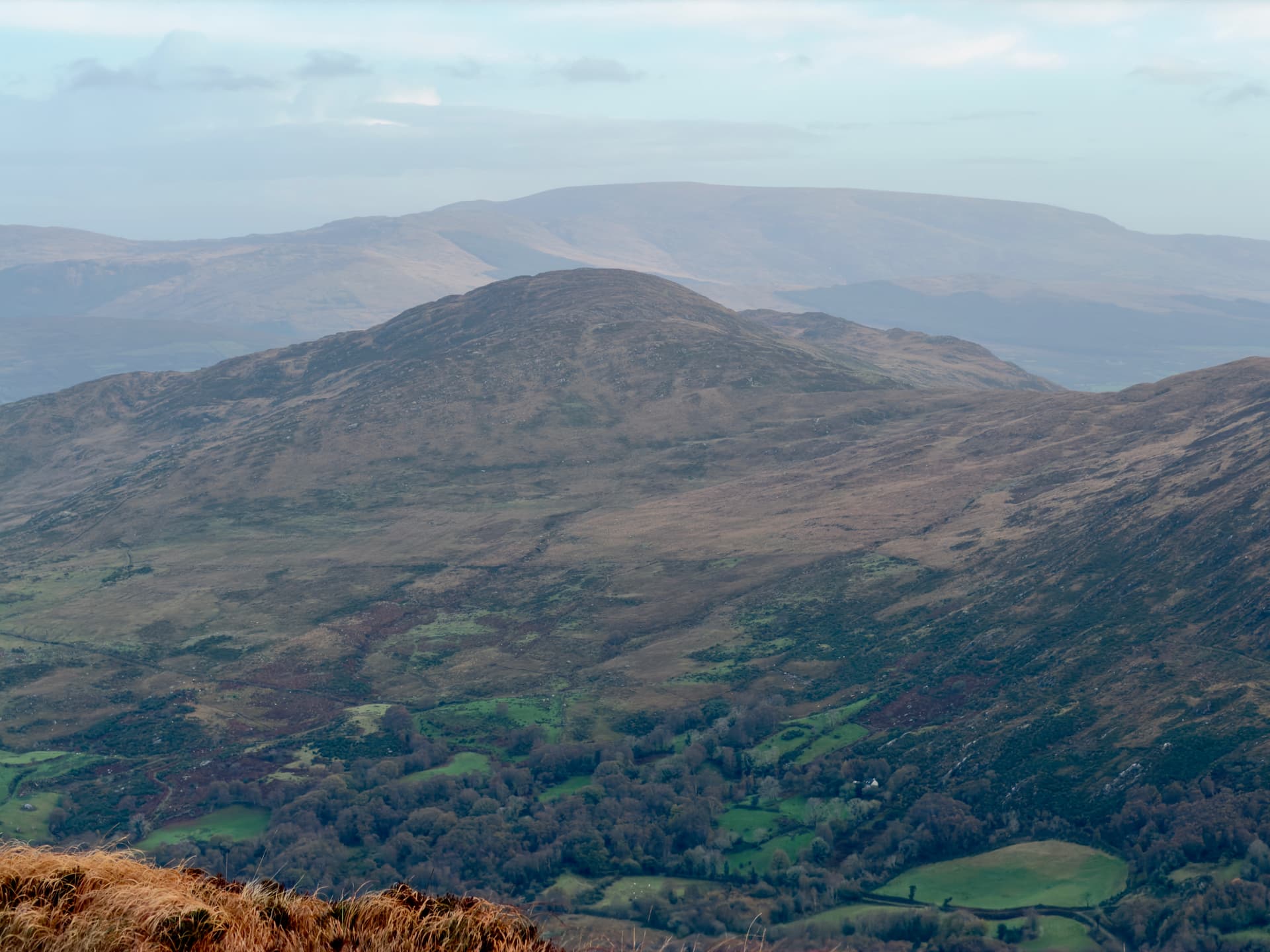 The saddle stretching west-south from Knocnagorraveela North East is a shallow one and maybe 30-40 minutes later I was on the proper Knocnagorraveela summit. The weather was beautiful. The top is not marked in any way; there’s no cairn or trigpoint. The 507-meter summit is technically a part of Caha Mountains, but the main Caha range is south of it, and clearly visible from Knocknagorraveela.