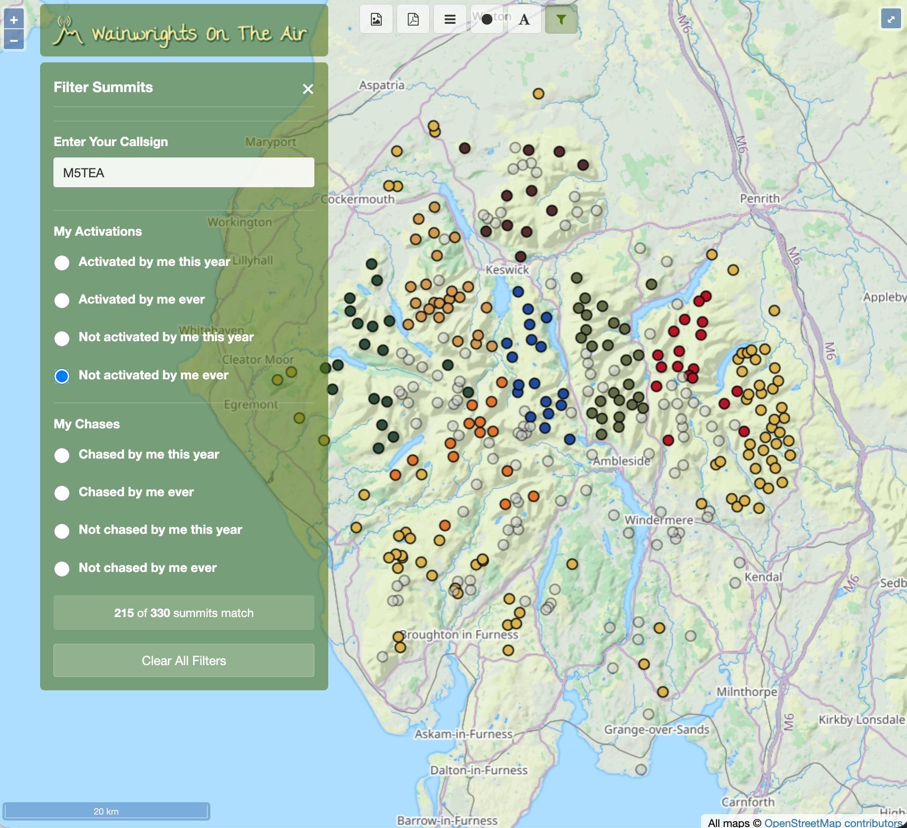 The WOTA Mapping application has been enhanced to support filtering based on summits activated or chased.