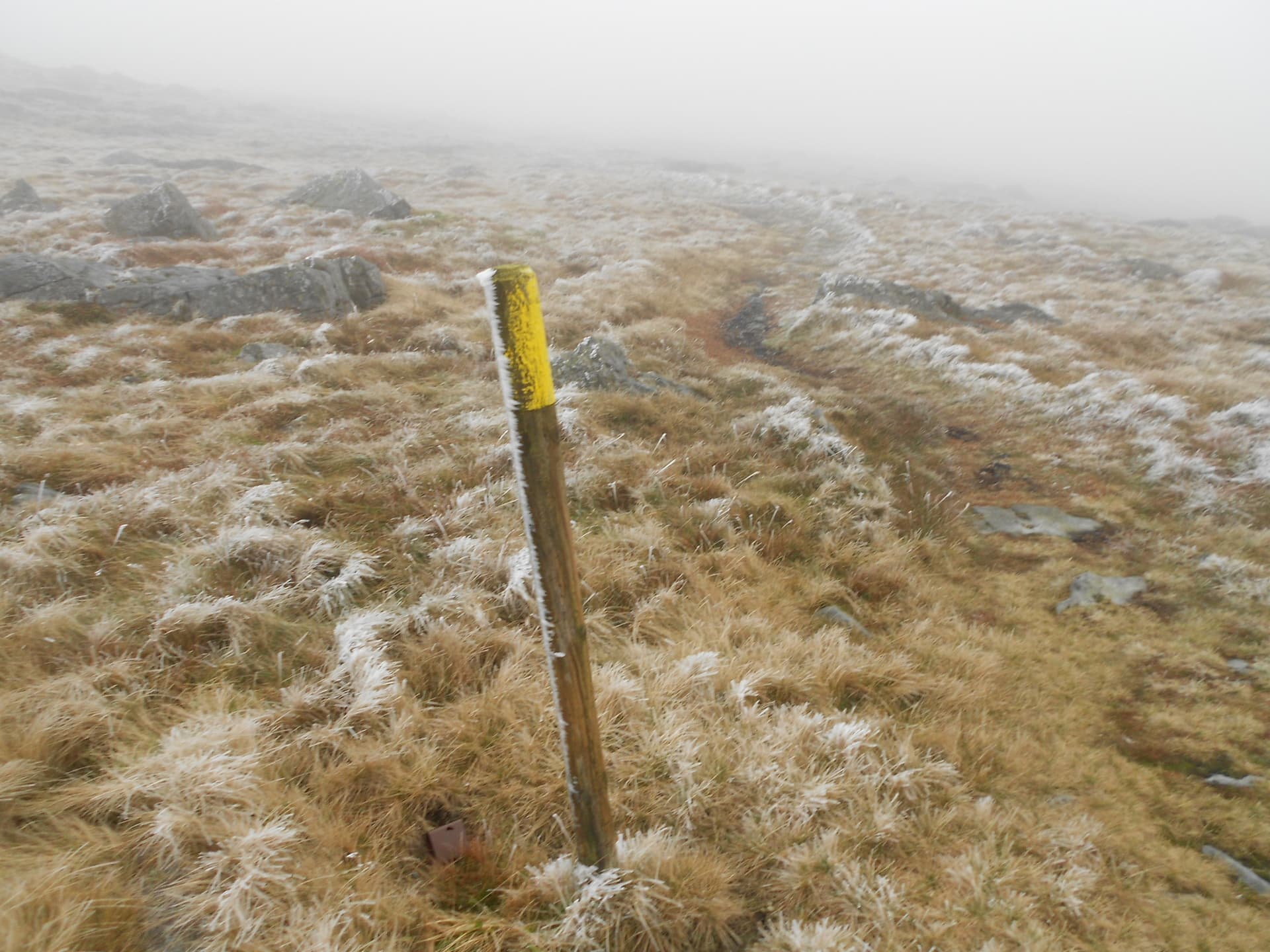 Once a couple of summit photos had been sent out via WhatsApp, the main priority was to get the Primaloft jacket on and the hood up. No matter how bad the weather is, I almost always walk up (and down) just with a fleece over a base layer. Today I had mitts on because I was using sticks; equipment I’m not yet used to.