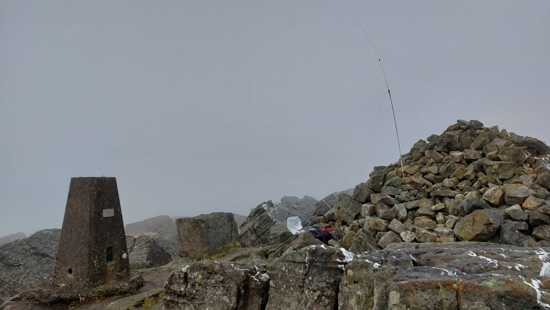 After assembling the mast to J-Pole (6 parts in all) I stuck it in the stones half way up the west side of the massive summit cairn where it blew over as soon as my back was turned. Here was the least of the wind but it wasn’t entirely sheltered as I would find in due course.