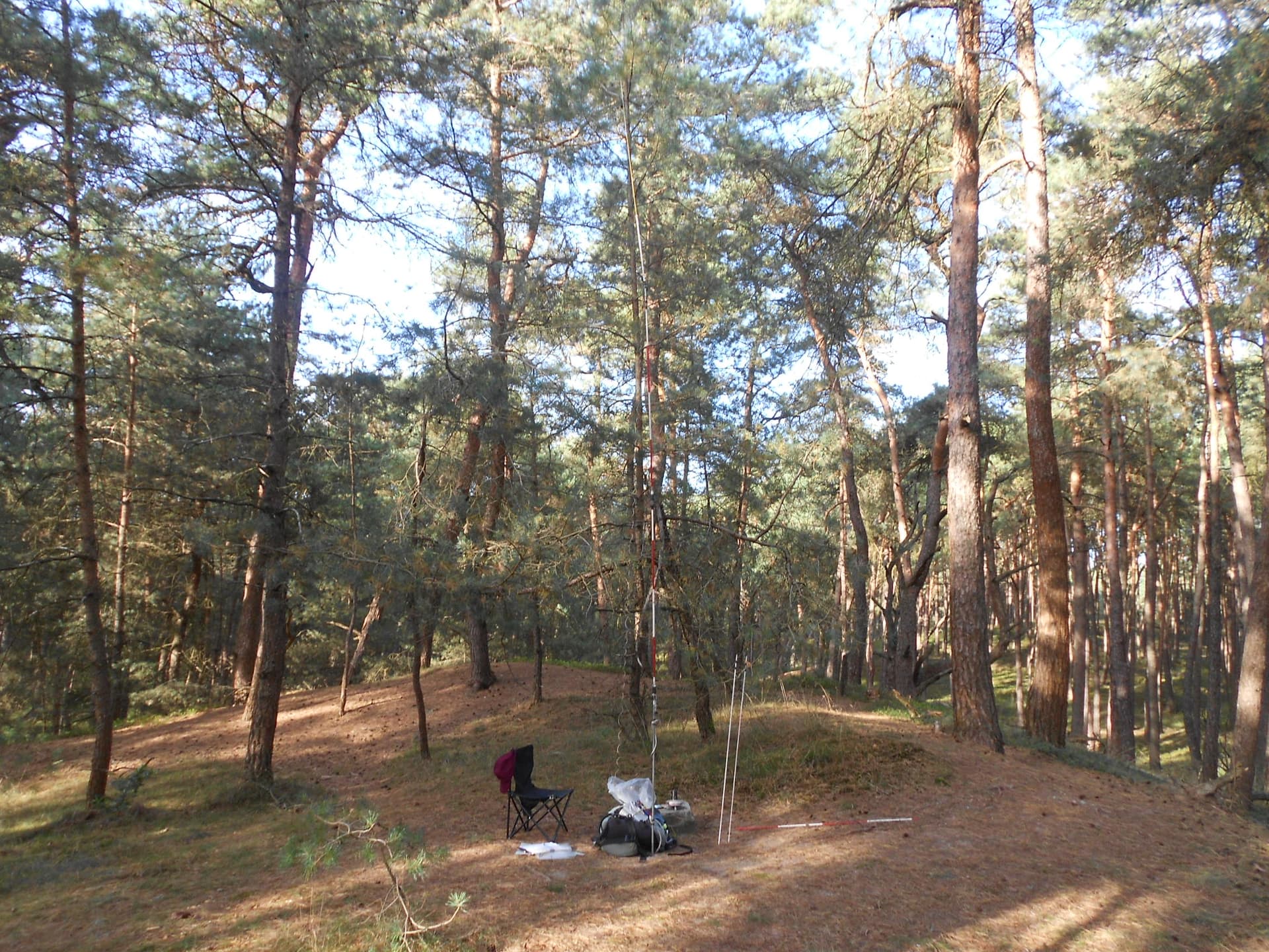 The summit proper is where Hans operates from and it’s where I decided to set up today. It’s hard to get an 80m dipole between the trees but now that mine is cut down to 40m, it was much easier to deploy there. The end sticks were not needed; two trees were at convenient locations to take the end strings.