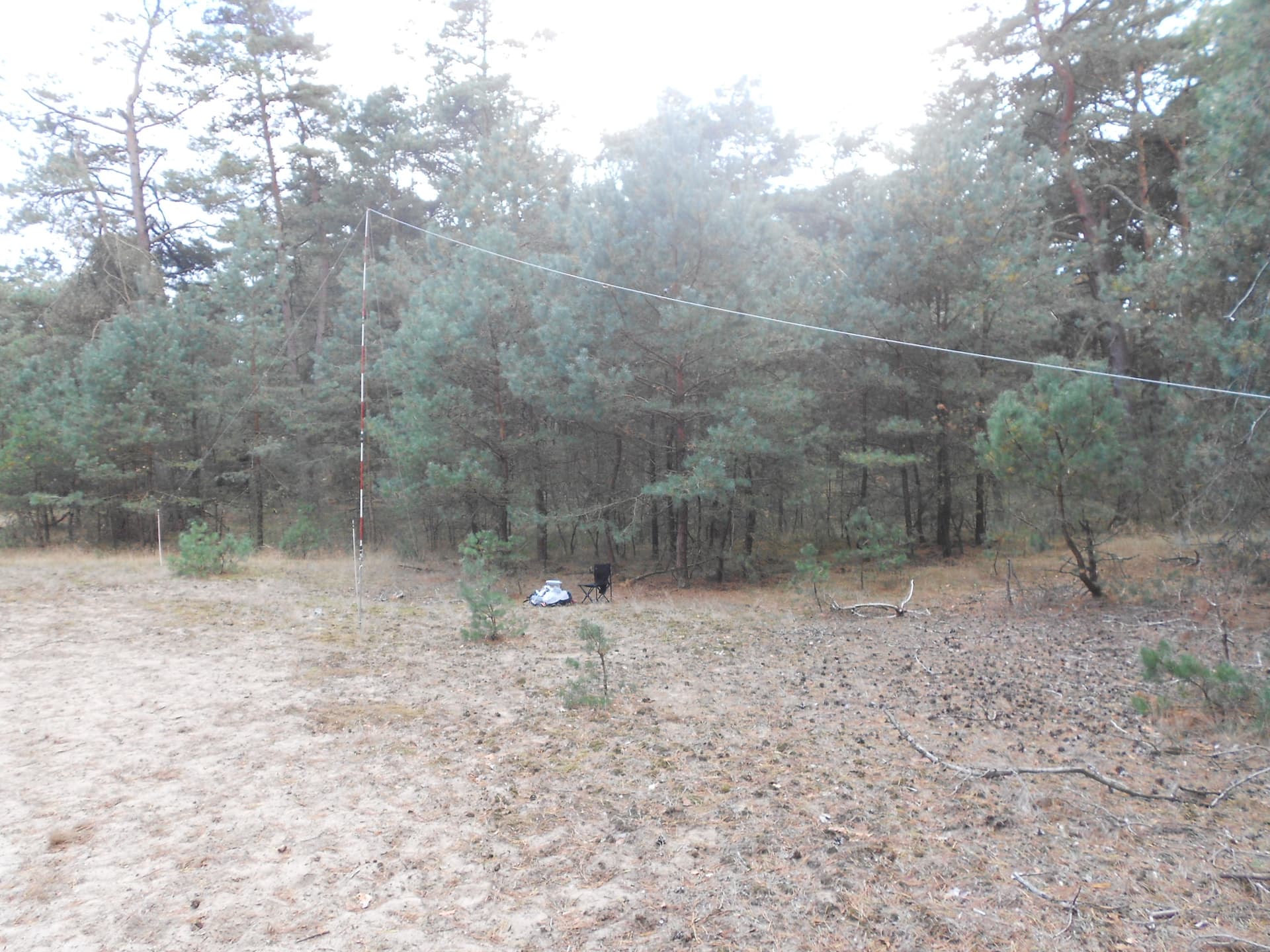 We walked to the summit marker together for a photo and Hans deployed his 12m long end-fed single wire antenna. This normally goes horizontally between the trees at low-height but today he decided to suspend it vertically from a 10m high telescopic mast. RG58 coax feeds his QRP rig via a 1:49 impedance matcher wound on a large ferrite ring and housed in a plastic box.