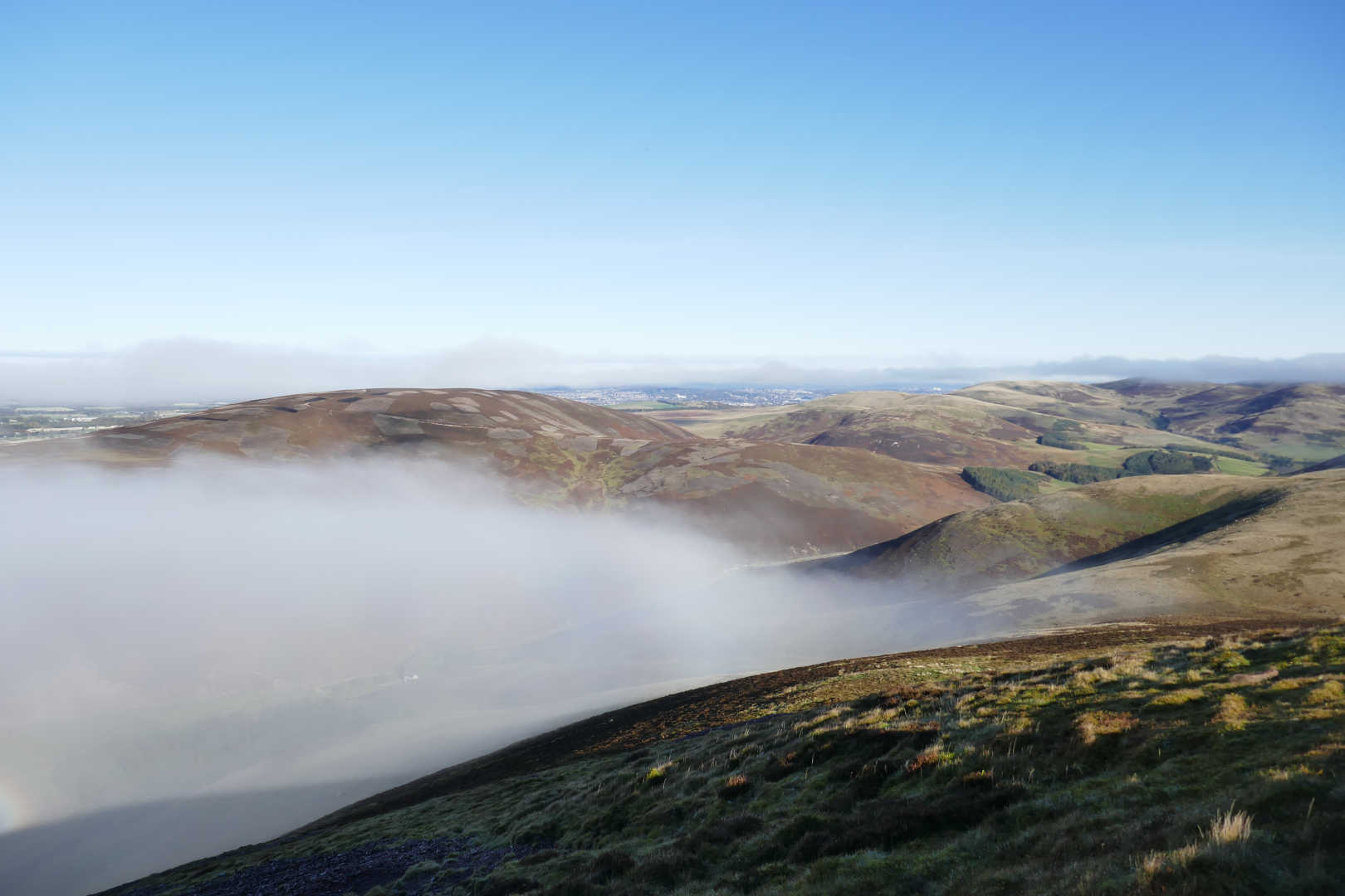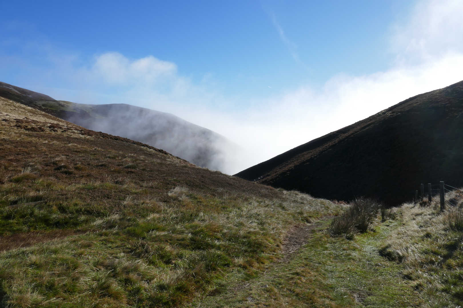At the col with Carnethy Hill looking down to the mist in the valley.