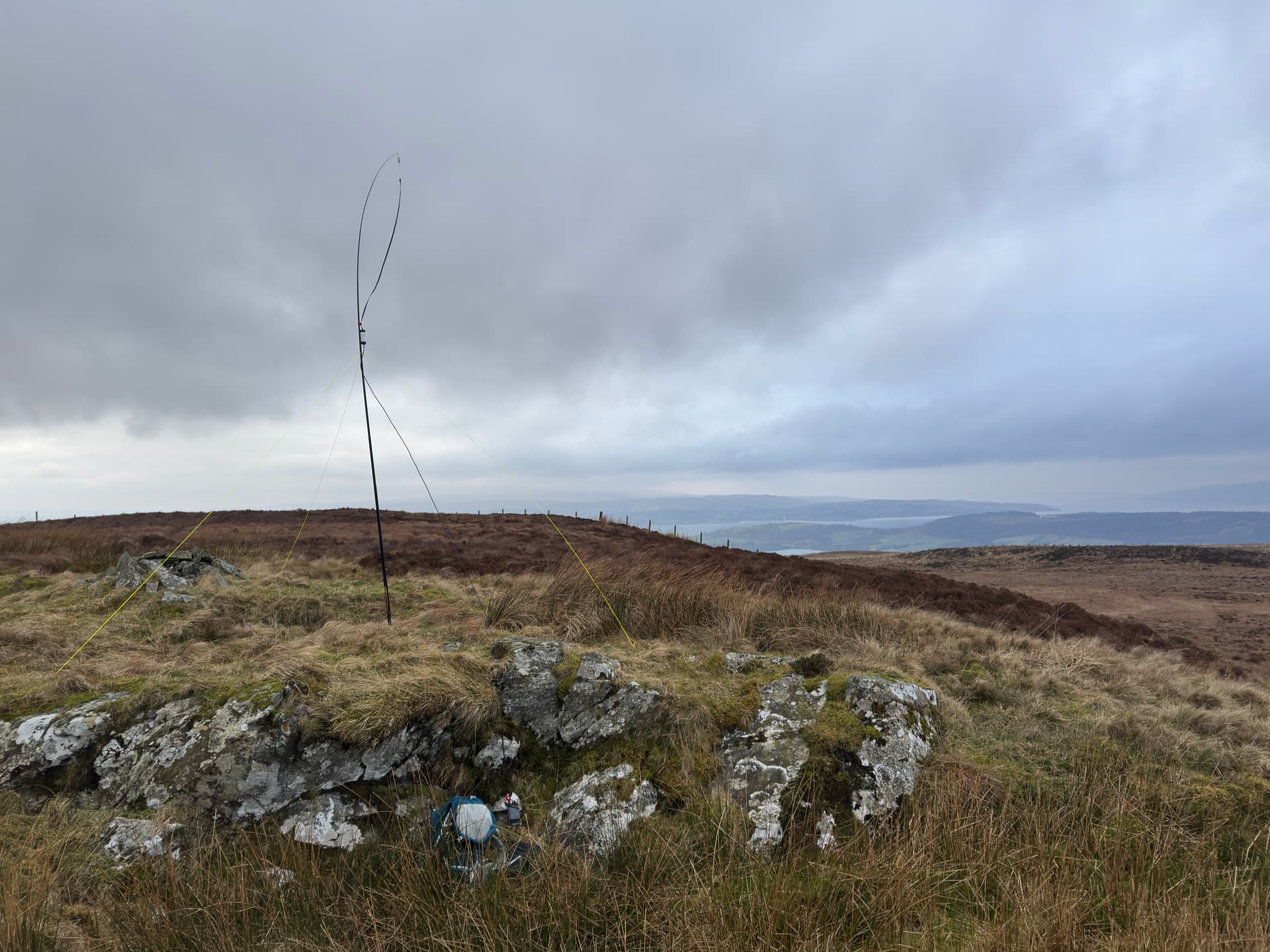 After a bit of faffing in the strong winds, I was able to get the Slim G mounted on the 4m pole, and get just enough coax down to operate in the wee natural den formed by these rocks. The trusty FT-270 was soon fired up, and I took a couple of false starts with a battery that wasn’t quite as charged as I thought it was, and my mast rigging not being quite as solid as I thought it was either. It wasn’t a day for hanging about, so I got my basic five contacts (four for the activation points plus one for luck) and decided it’d be a good time to get out of there pronto after a victorious summit selfie.