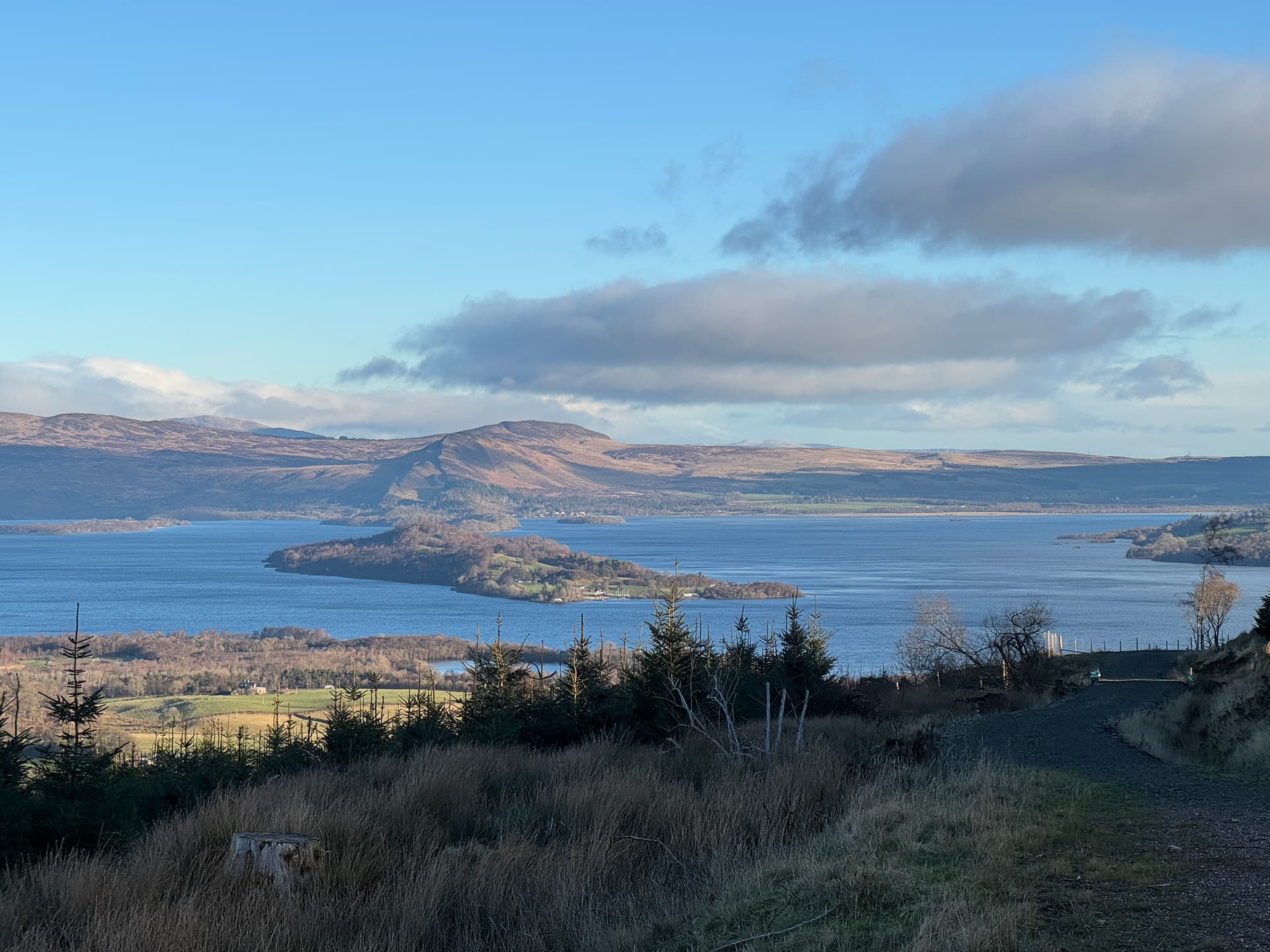 I left the car in the small car park just off the A818 at NS 328 842. There looked to be room for about 6-8 cars, and although the place was fairly busy with folk out for wee strolls with dogs and such, I was able to get a space without too much trouble. The track up was good, straightforward forestry track, following the John Muir Way most of the way up, with only a few frozen puddles to have to sidestep. As I ascended, the view across to Loch Lomond started to open up, the view across Inchmurrin and Inchcailloch to the ridge of Conic Hill made the appearance of the Highland Boundary Fault particularly clear.