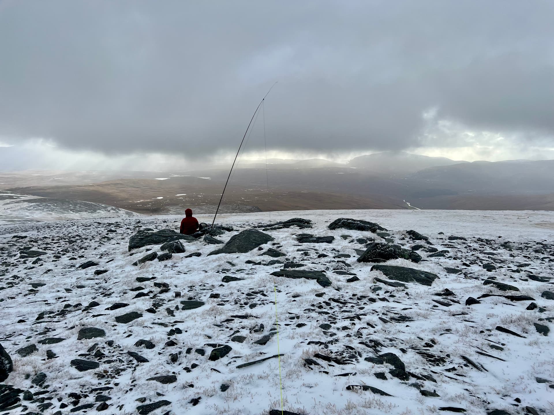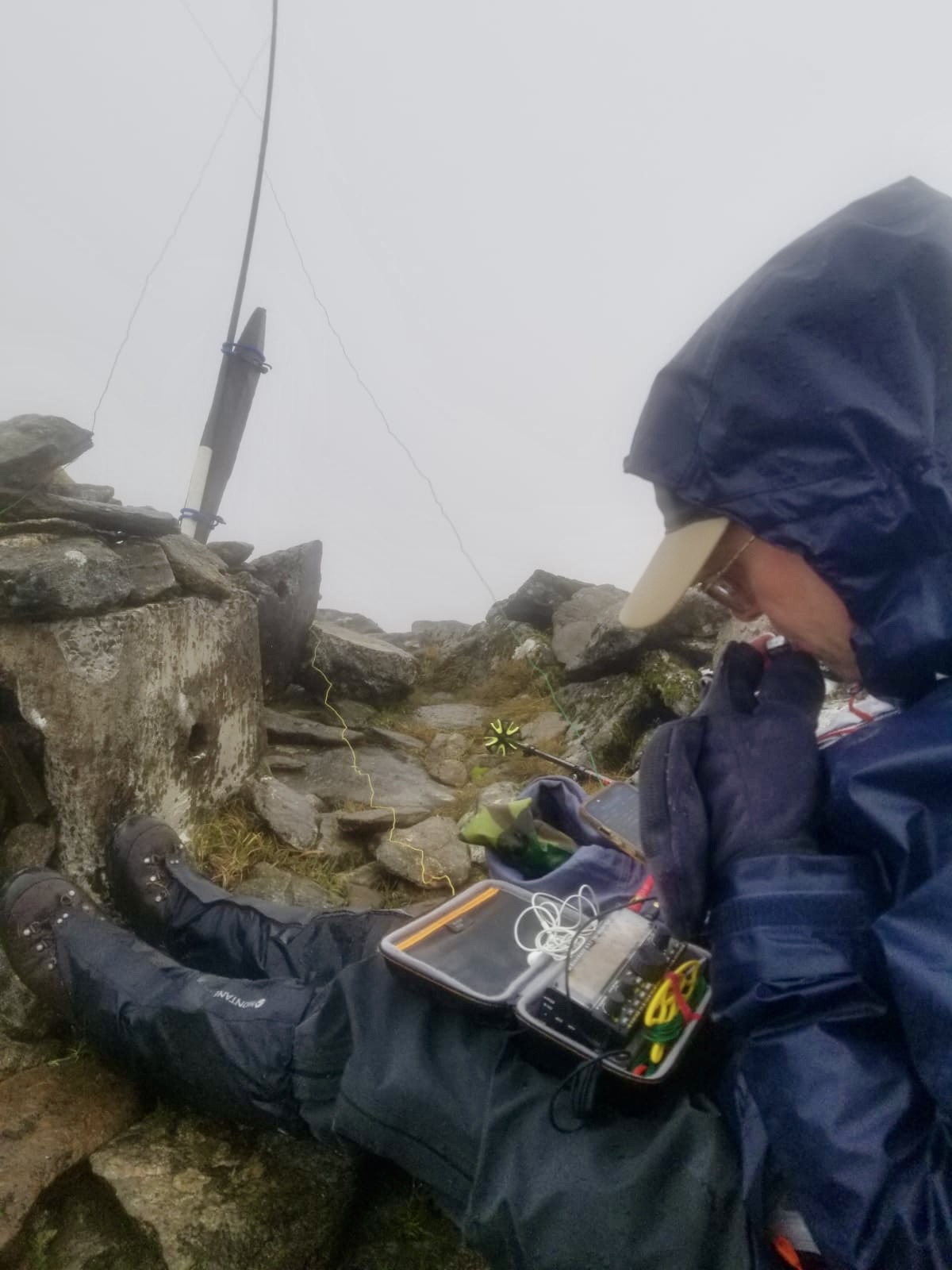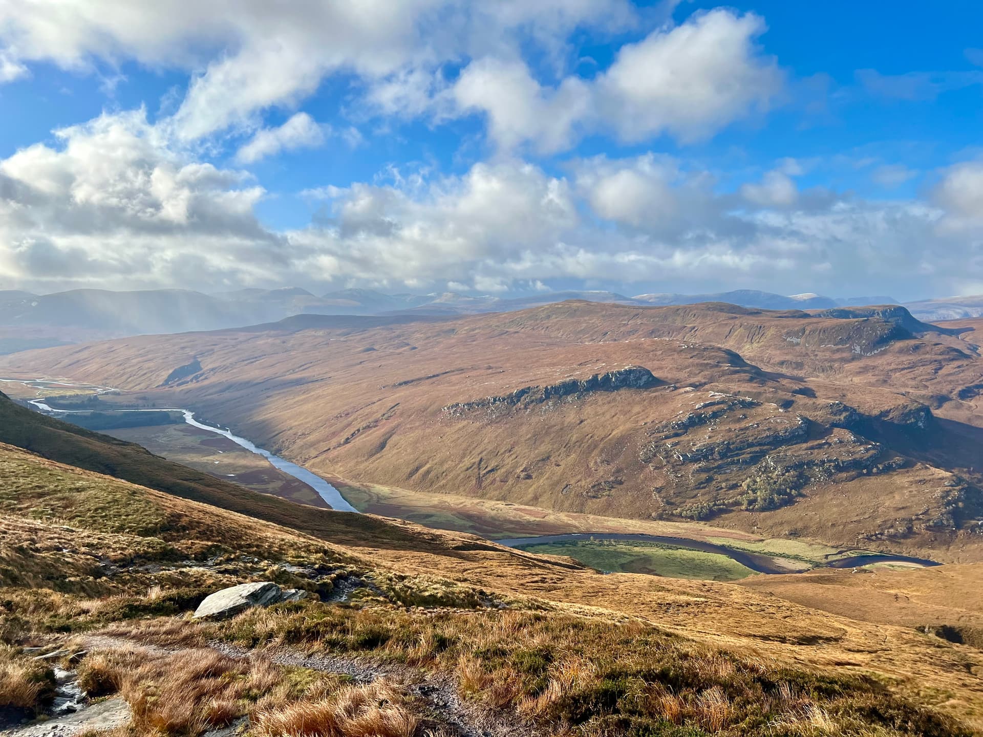 With it being reasonably nice on top, I thought I’d maybe be able to spend more than 4 minutes on the air, and things started off well on 40m. Half way through a QSO with Jack, @GM4COX, the mast blew down and whipped the antenna out of the banana socket. I looked up from the radio to find the view gone and replaced entirely by white cloud and snow with a gale to push it sideways. I scrambled over to reconnect and finish the QSO with Jack before taking the hint and packing up. Turns out 4 minutes was all I got this time as well! Once we were back down around 850m, the hill sheltered us again. The descent offered a nice view to the south as we retraced our steps, with only a few showers to keep our heads down. The cloud seemed to follow us down, and by the time we were back at the car it was around 500m, so we managed to get the best weather window.