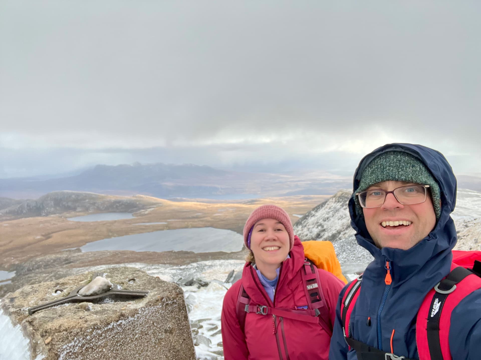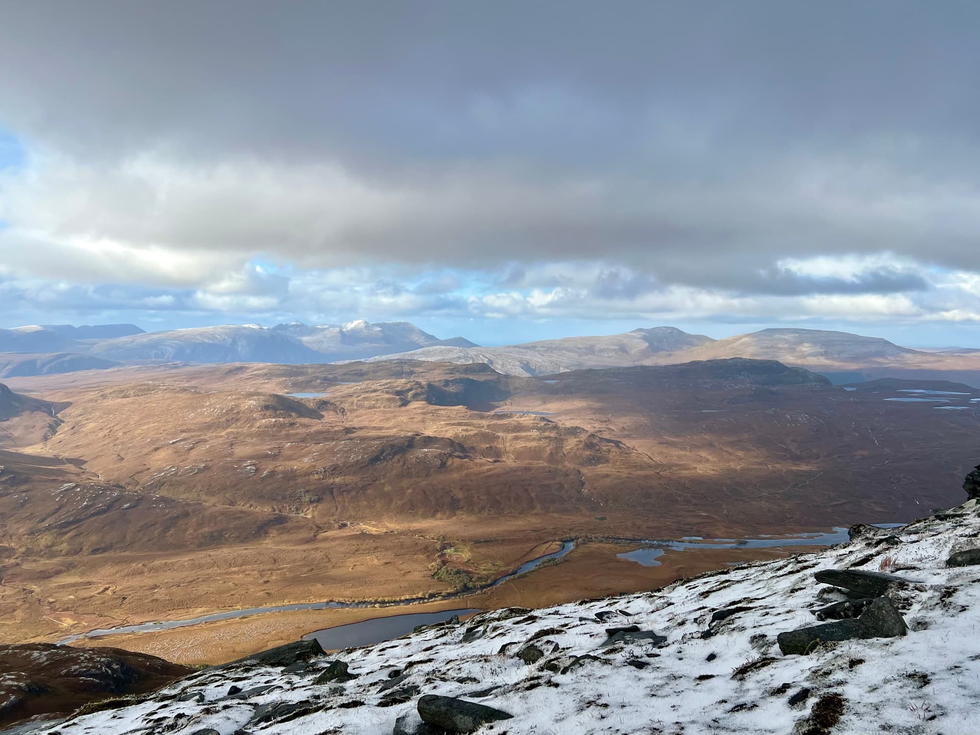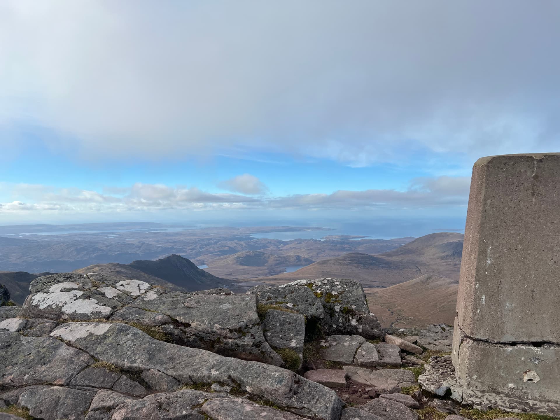 Apart from some hail, and a light snow shower, our ascent was very pleasent, with great views all around, particularly to the west where a snow topped Foinaven was clear to see. At the summit, we were fortunate to still be out of the cloud and see all around. The gusts were strong but nothing worse than yesterday. The trig point doesn’t offer much shelter so I looked elsewhere to setup.