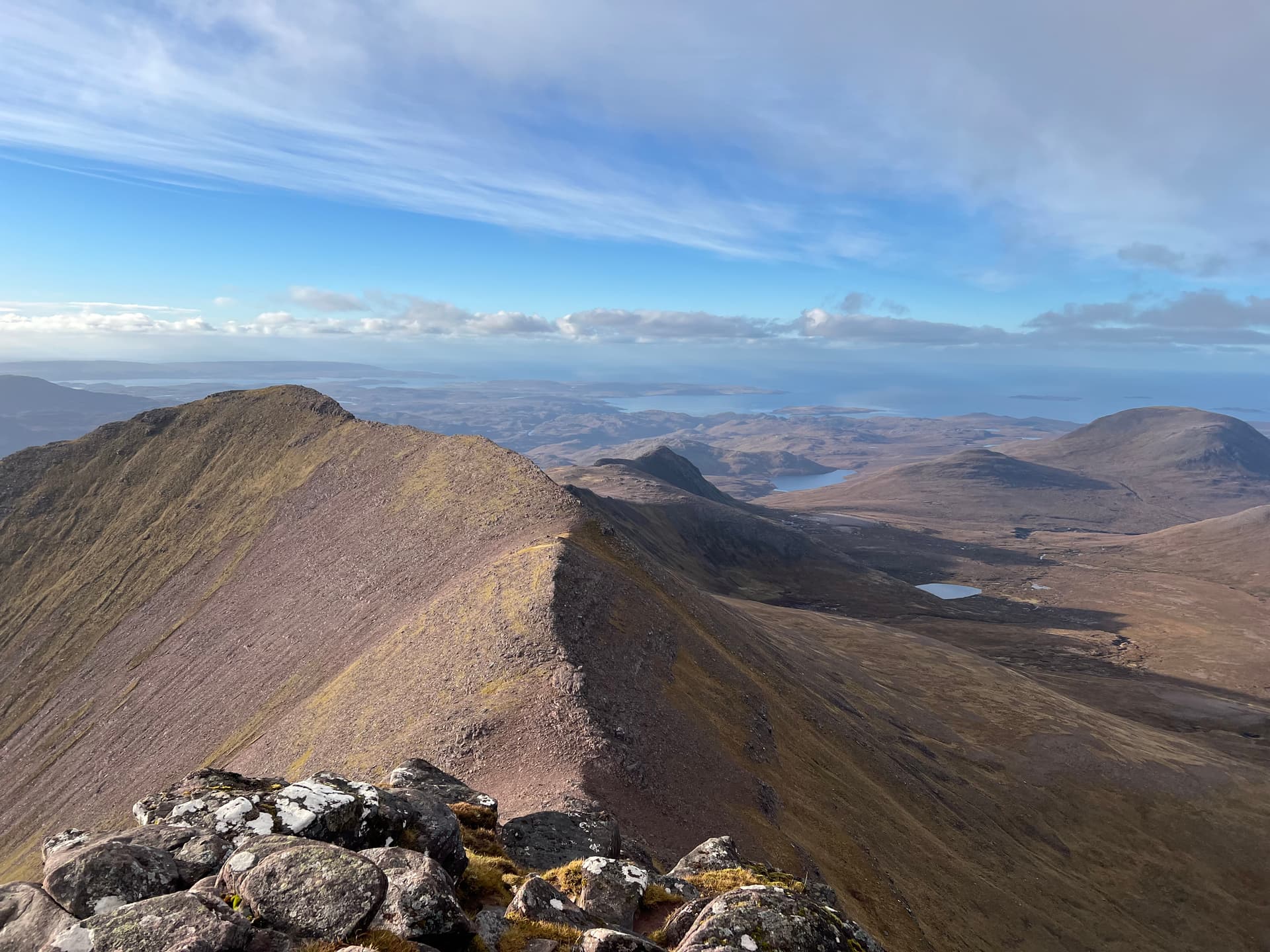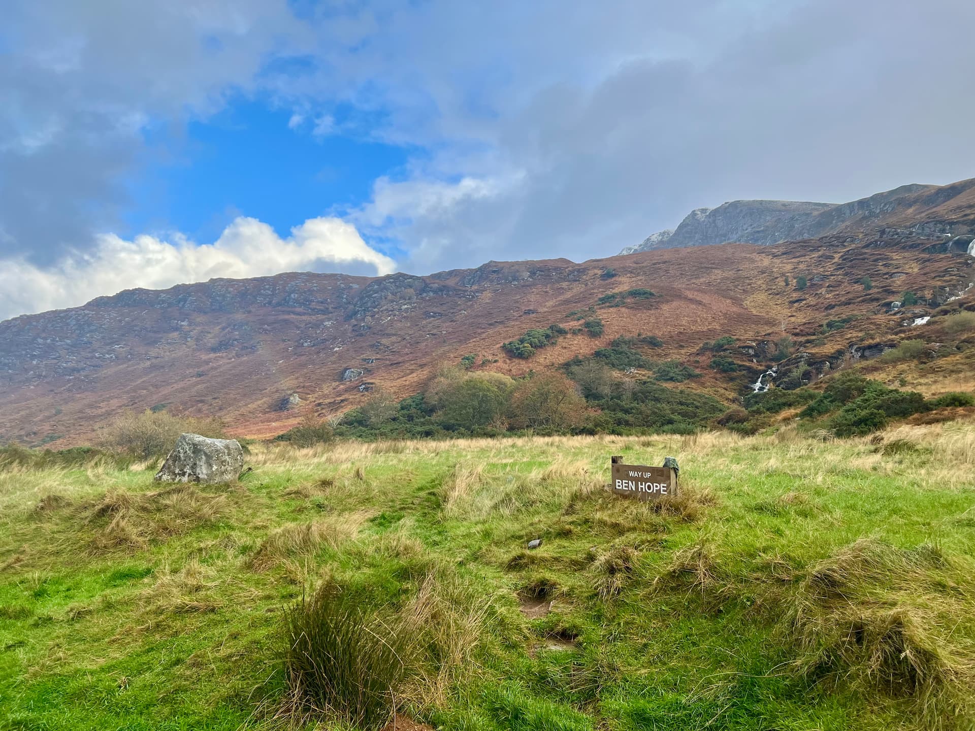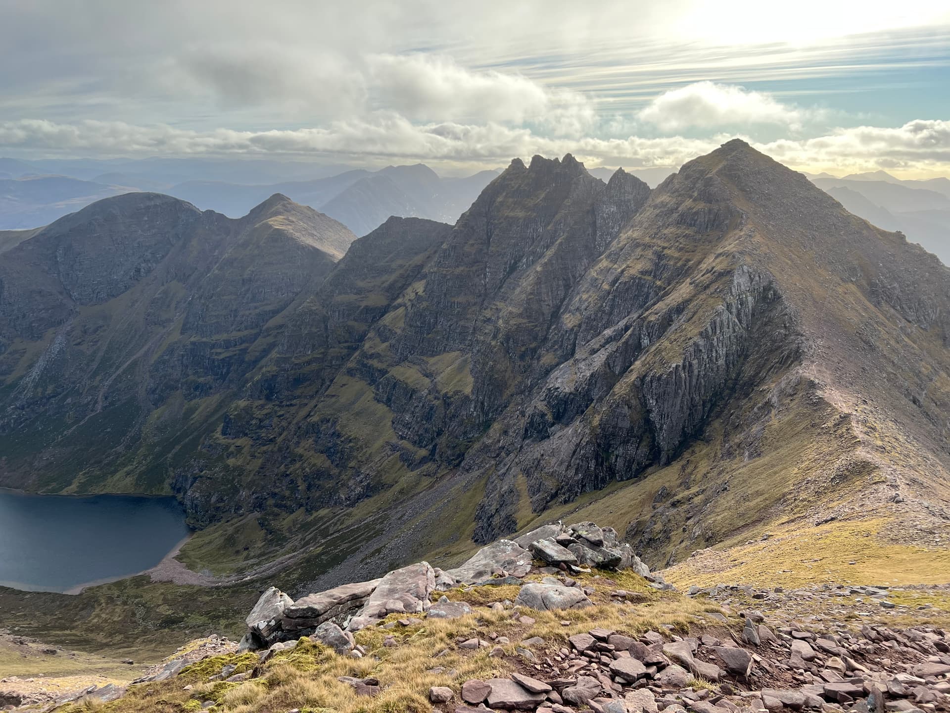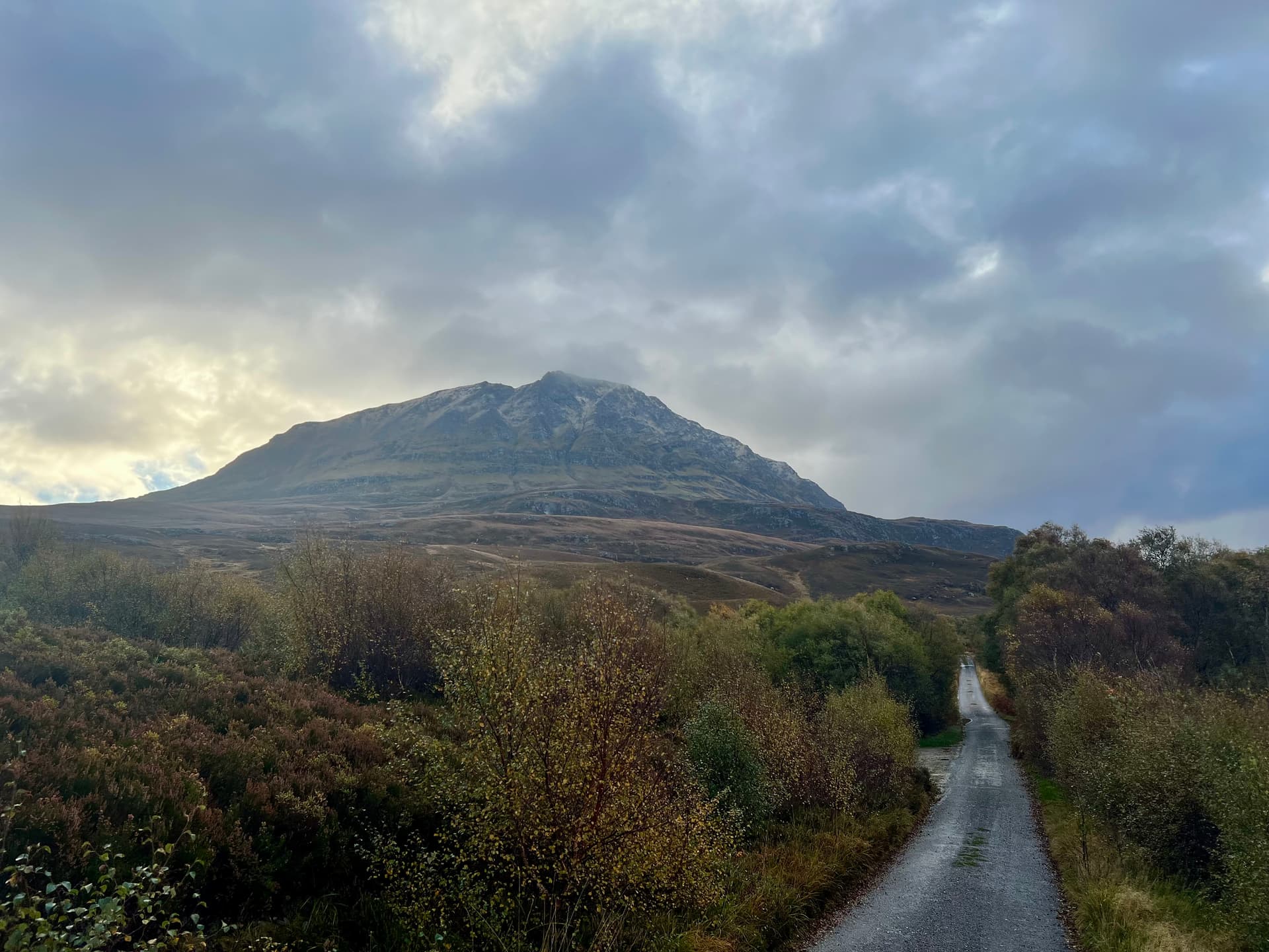 Leaving Aberdeen in the cloud, and listening to the reports of storm Benjamin in the south, I passed Inverness under blue skies and enjoyed the drive towards Ullapool and the start point next to the Dundonnell Mountain Rescue centre. The weather was stunning.