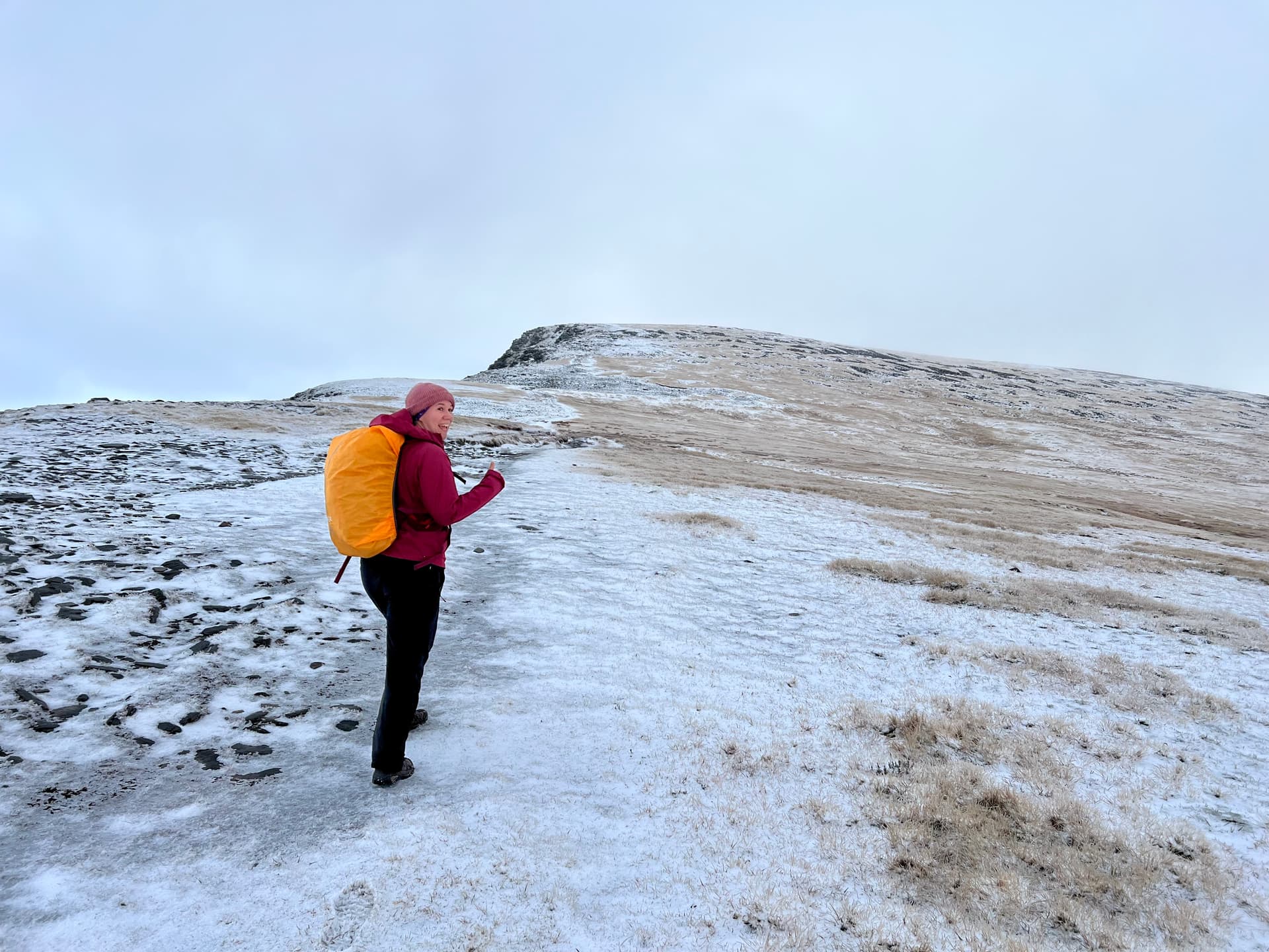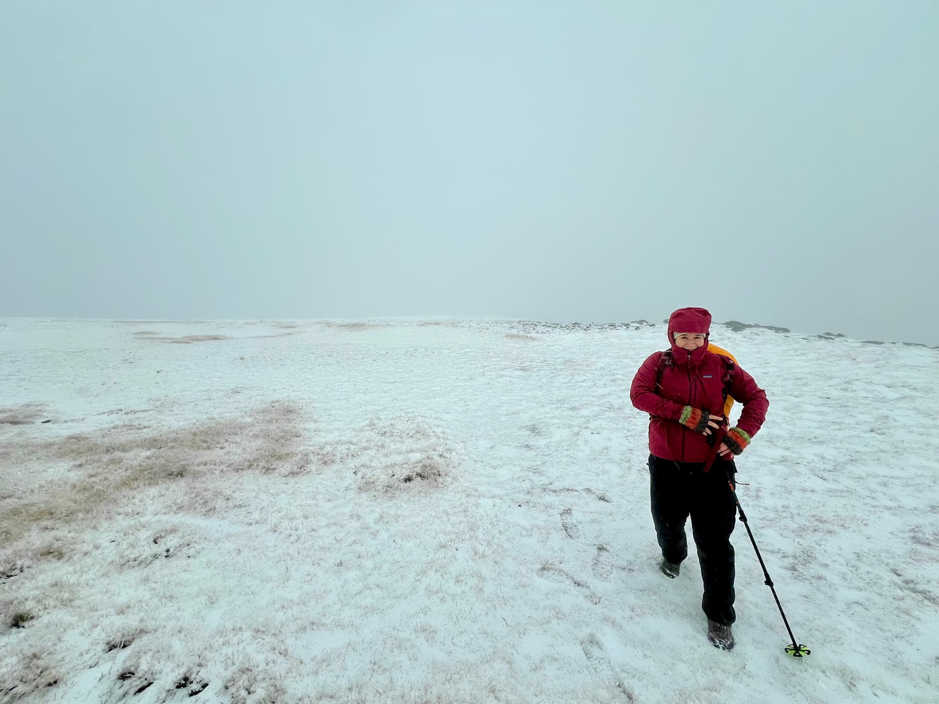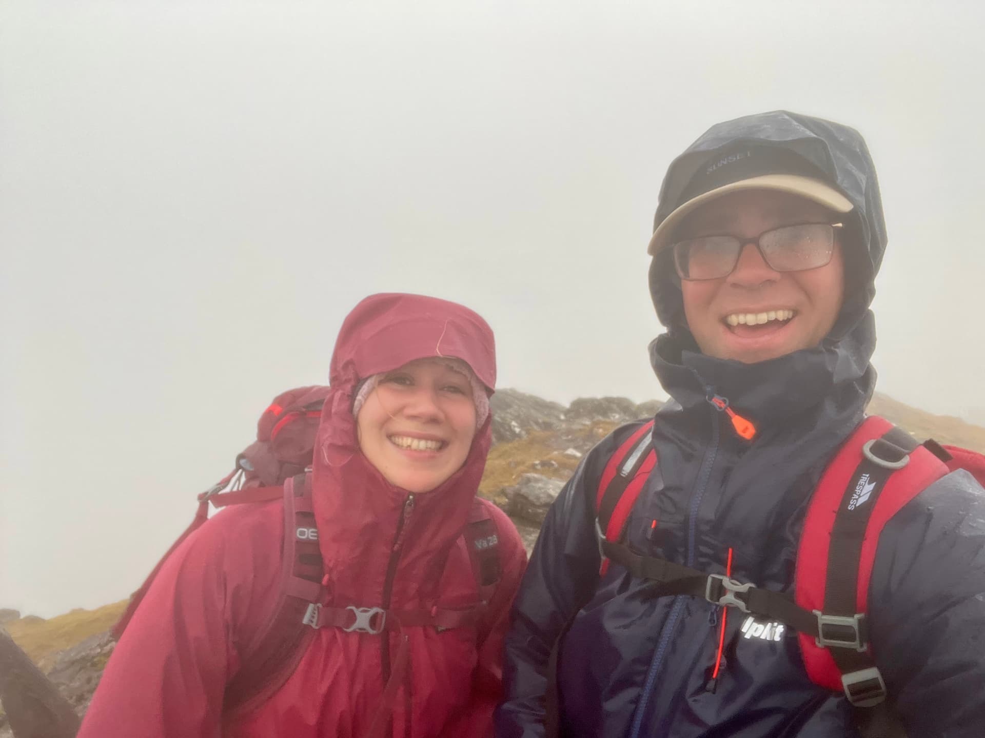 We were in the cloud, it was windy and often wet. We met one walker on the way down who described the summit as “brutal”. After what can only be described as a trudge, we finally made it to the last part of the ascent. It was steep, the wind was fierce and the rain drops were needles in your face, but we got to the top and ducked down behind the small shelter.