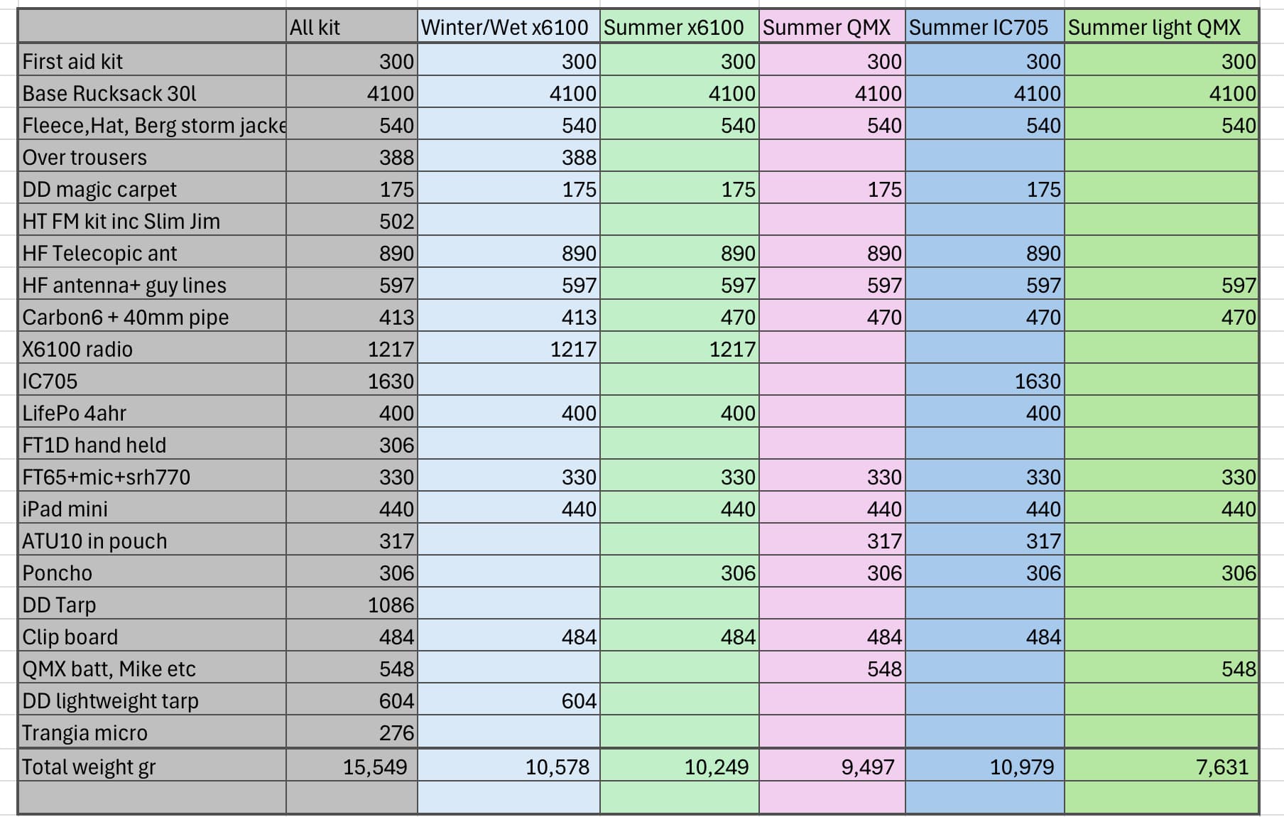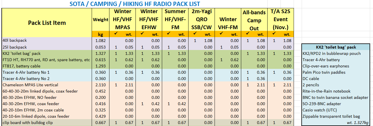 Part of the spreadsheet - NB: KX2 bag & contents on R.H.S., wt. 1.3kg