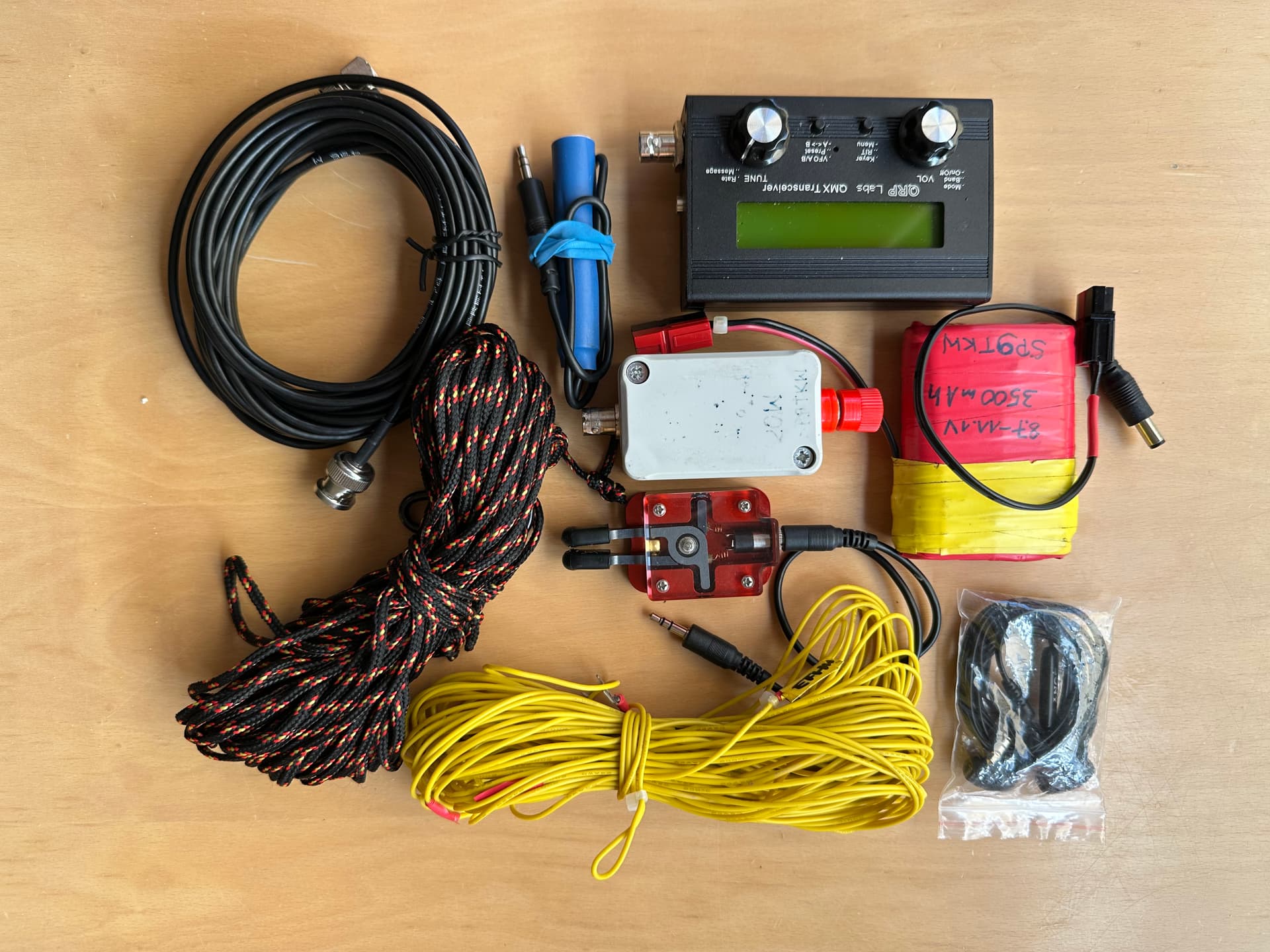 Consists of a QMX, battery pack (8xAA lithium for 12V), telescopic antenna with interchangable coils, counterpoise cable, CW key, hearphones.