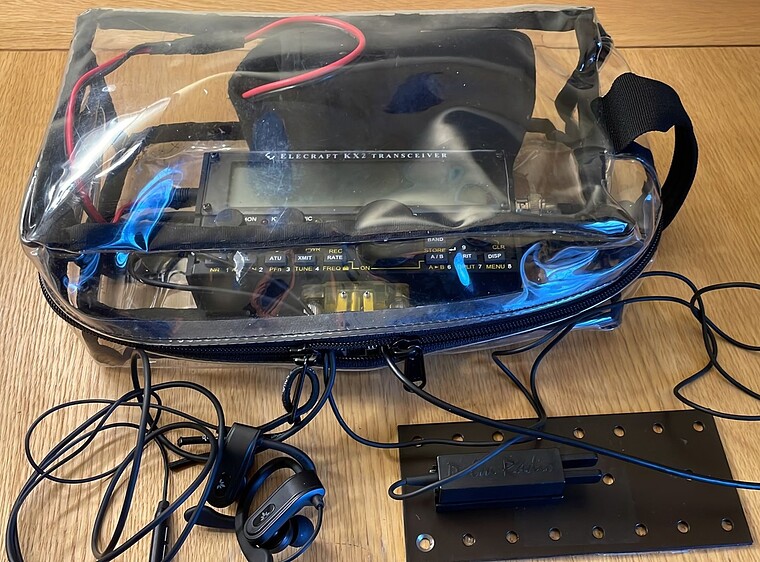 I usually carry the KX2 [in homemade bubble-wrap pouch] & battery, paddles, etc inside a large transparent toilet bag. If I didnāt take a tarp and it rains unexpectedly, the toilet bag (laying on its side) also serves as a rig shelter whilst Iām QRV.