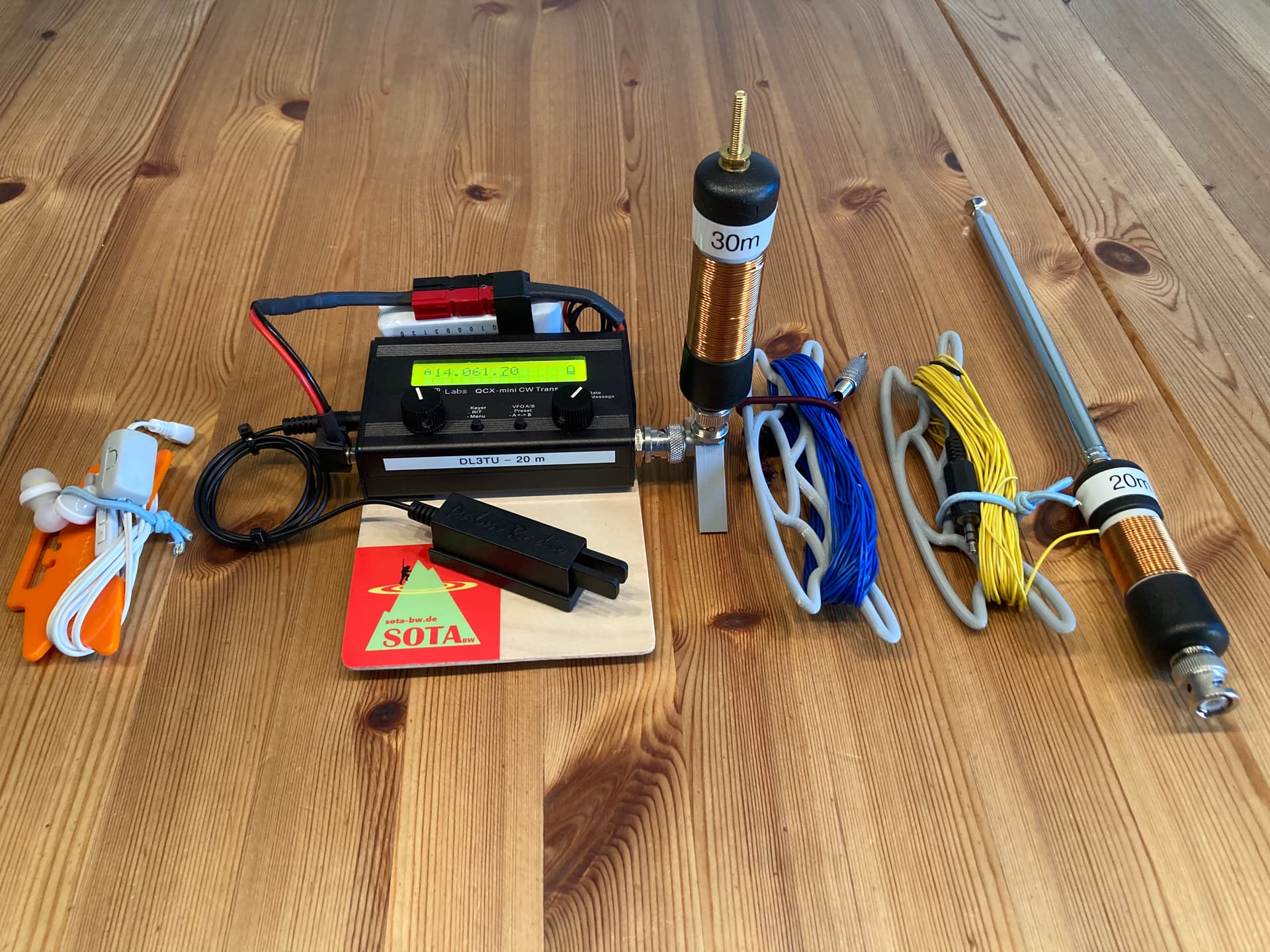 1. On summits where weight and space becomes more important, I’m using the following setup. It offers three bands (40/30/20) and at least 5 watts. Antenna performance is still good, 1000mAh are sufficient for 2-3 activations. Weight is 1050 g.