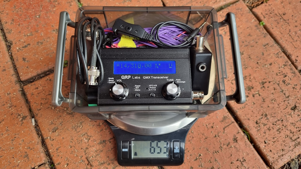 QMX portable setup, nothing startling. Station with QMX, inbuilt battery and speaker amp, microphone and three band End Fed Half Wave antenna. Total in light plastic box is 653 grams.