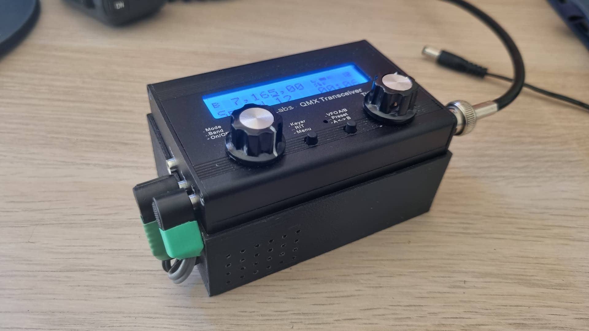 The amp, battery and speaker fit in a 3d printed case with the QMX on top.